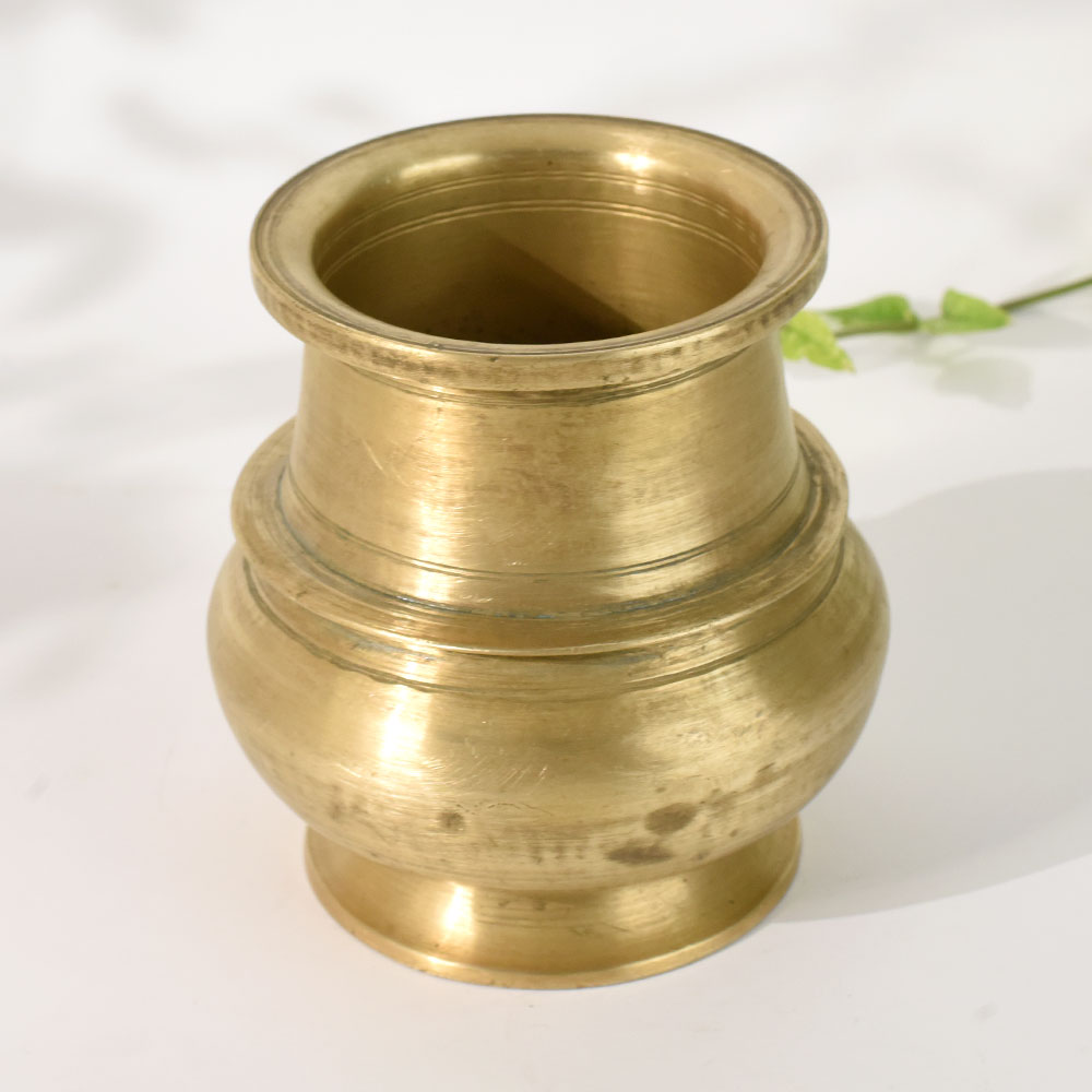 Bring home a piece of timeless South Indian heritage with this vintage handmade brass holy water pot, crafted using traditional metalworking techniques passed down through generations. Made from high-quality solid brass, this pot features a classic rounded base, flared mouth, and fine engraved lines that reflect the artistry of rural South Indian craftsmen. Traditionally used in temples and homes during rituals, poojas, and ceremonies, this brass water pot now also serves as a beautiful decorative collectible that adds warmth and authenticity to any space. Its naturally aged patina enhances its vintage appeal, making it a meaningful gift for lovers of cultural artifacts, spiritual dcor, or antique brassware. Whether used for ritual purposes or displayed as an accent piece, this handcrafted holy water pot stands as a symbol of devotion, craftsmanship, and heritage.