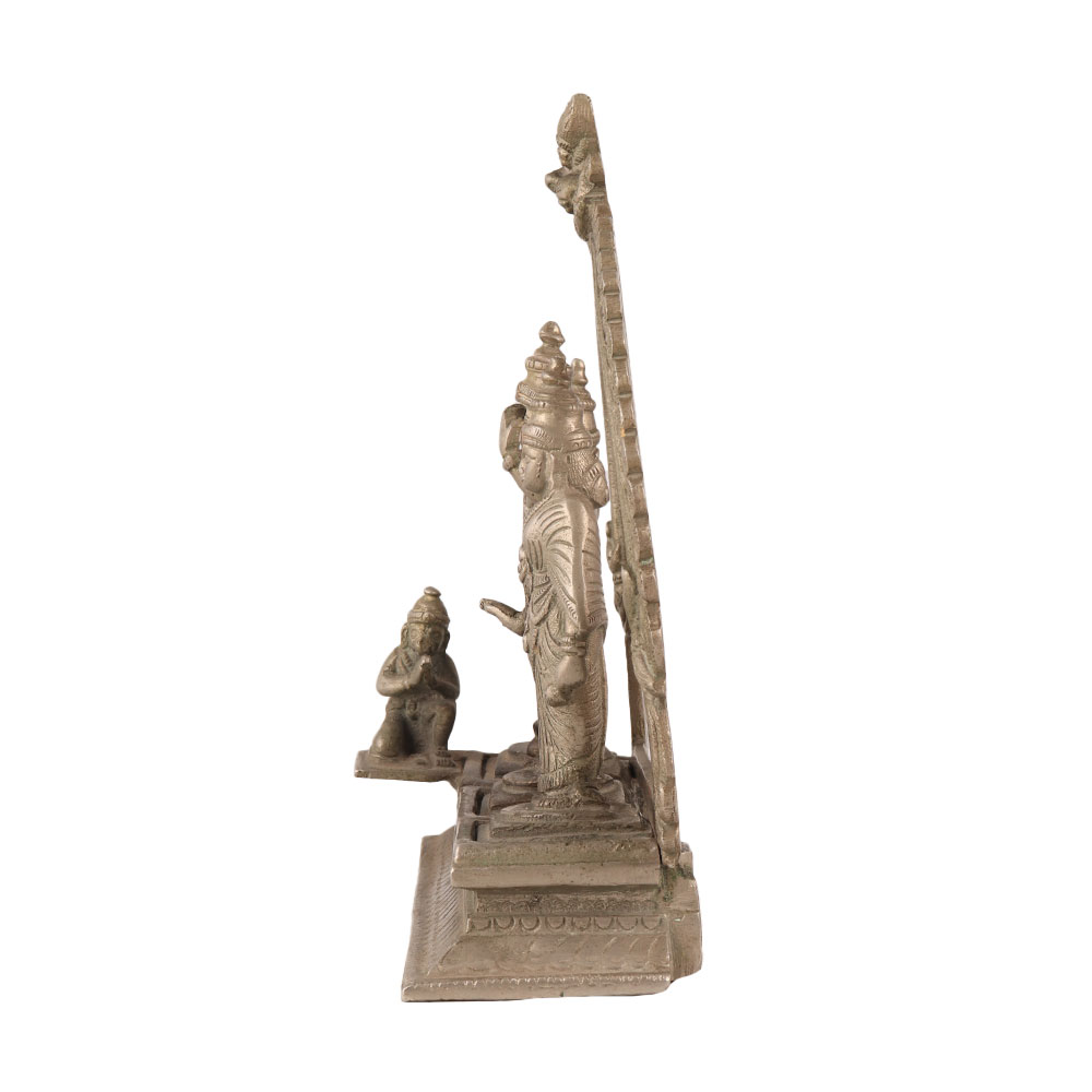 Buy a brass statue of Ram Darbar in a stunning silver finish that is a masterpiece crafted by skilled Indian artisans. Depicting the Hindu God Lord Ram, along with his divine consort Goddess Sita, devoted brother Lord Laxman, and devoted devotee Lord Hanuman, this intricately detailed statue captures the essence of the revered Ram Darbar scene. The statue is perfect for worship at temples or as a centrepiece in your home's prayer room, adding a touch of divinity to any space. Its versatility makes it a perfect addition to restaurants, hotels, gyms, spas, shops, or offices, infusing an auspicious aura wherever it is placed. Handmade with love and attention to detail, this Ram Darbar statue is not only a beautiful piece of art but also a meaningful and thoughtful gift for your loved ones, symbolizing blessings, protection, and prosperity. Bring the divine presence of Lord Ram, Goddess Sita, Lord Laxman, and Lord Hanuman into your life with this exquisite silver-finish brass statue of Ram Darbar.