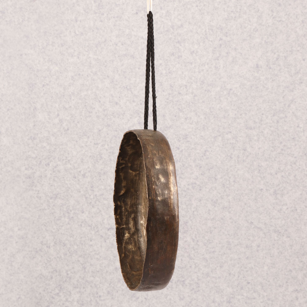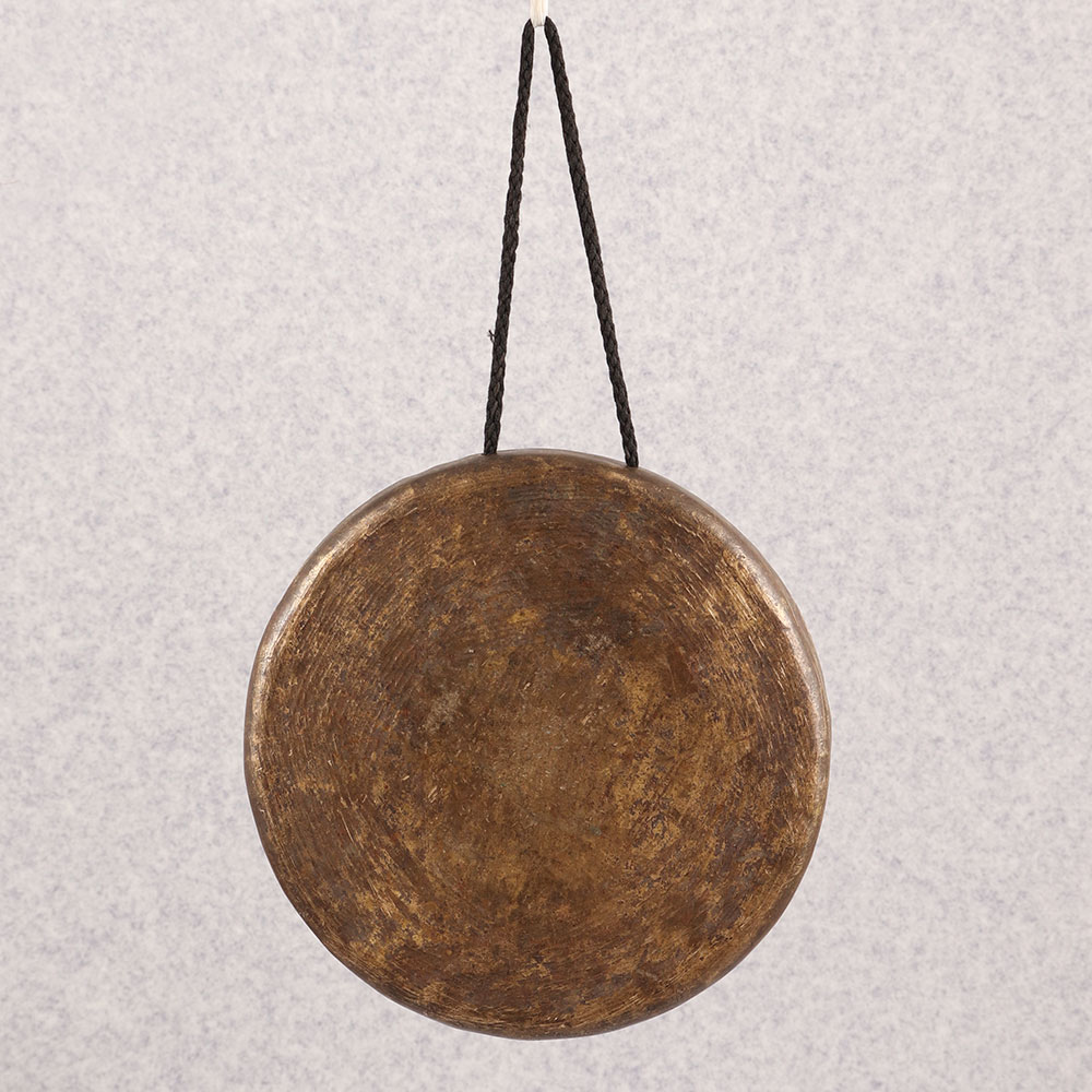 Enhance your space with the timeless charm of our Vintage Bell Metal Gong that is a masterpiece crafted by highly talented artisans in the intricate Tibetan Art tradition. This piece boasts a rich antique brown finish, exuding an aura of authenticity and sophistication. Meticulously handmade from high-quality bell metal, it resonates with a distinct, melodic tone that transports you to a bygone era. The gong comes complete with a string for easy hanging, allowing it to grace your home, office, restaurant, hotel, or cafe with its elegant presence. Its versatile design makes it a captivating decoration, adding a touch of cultural allure to any setting. Beyond its aesthetic appeal, this gong serves a purpose - its gentle tones can be used for meditation, relaxation, or to mark significant moments in your day. Ideal for vintage enthusiasts, this bell metal gong is a remarkable addition to any collector's trove. Moreover, it makes for a thoughtful and meaningful gift for your family, friends or relatives on special, festive, or auspicious occasions.
