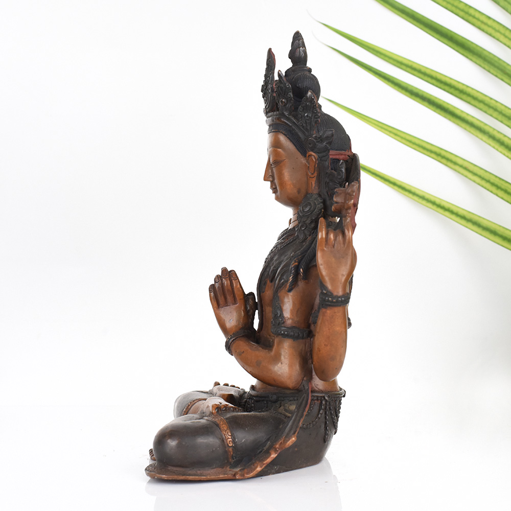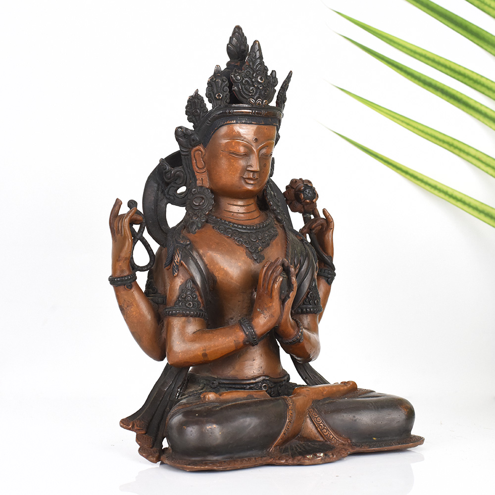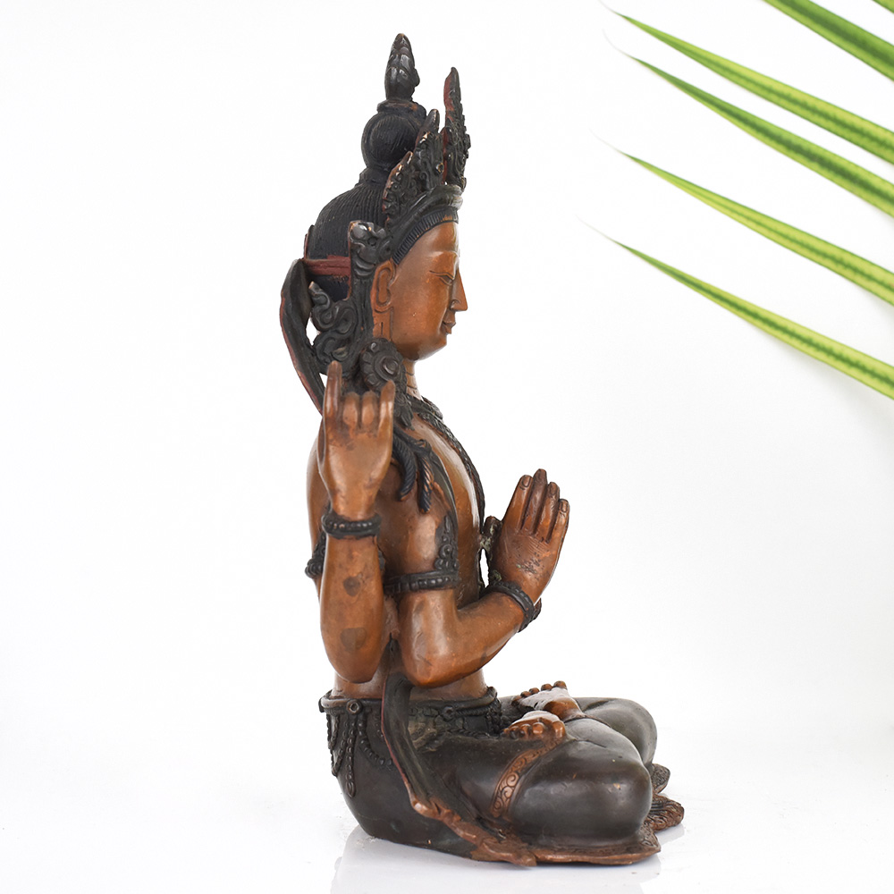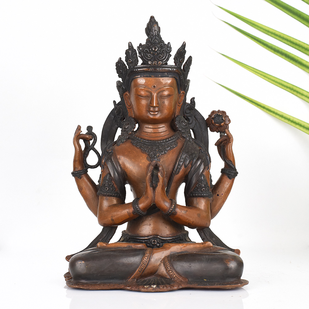 Chenrezig, also known as Avalokiteshvara, is the embodiment of compassion in Tibetan Buddhism. This exquisite vintage copper statue captures the deity's serene expression and meditative pose, inviting you to cultivate your own sense of empathy and loving-kindness. Crafted with care using traditional Tibetan techniques, the statue is made from durable copper that will withstand the test of time. Whether you're an experienced Buddhist practitioner or simply seeking to bring more mindfulness into your life, this Chenrezig statue can be a powerful addition to your sacred space. Place it on your meditation altar, in a quiet corner of your home, or anywhere you wish to encourage a sense of peace and reflection. As you gaze upon the statue, allow its calming presence to guide you inward, helping you connect with the infinite wellspring of compassion that resides within.