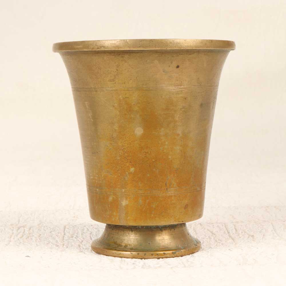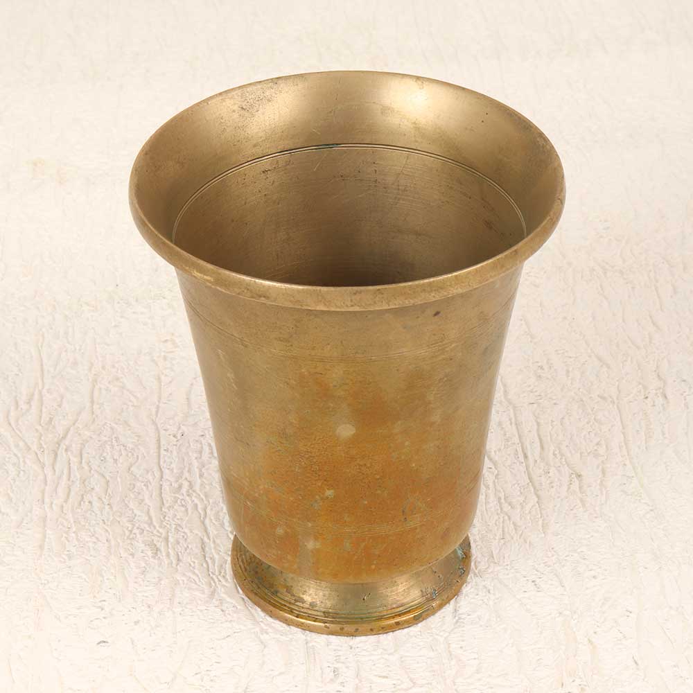 Elevate your home and worship with this antiqued brass Panchpatra Water Pot. Cast from durable brass in a hand-finished brown patina, this pot has an elegant vintage look. With its earthy finish and delicate South Indian craftsmanship, this pot brings a whisper of history to your decor and rituals. Use it to store pure water for offerings, or place it on your meditation altar to focus your practice. The cool, smooth brass calms the skin during yoga and prayer. Connect with ancient traditions and artistry with this vintage brass Panchpatra pot. Its spiritually symbolic form and antique patina infuse your space with serenity and meaning.