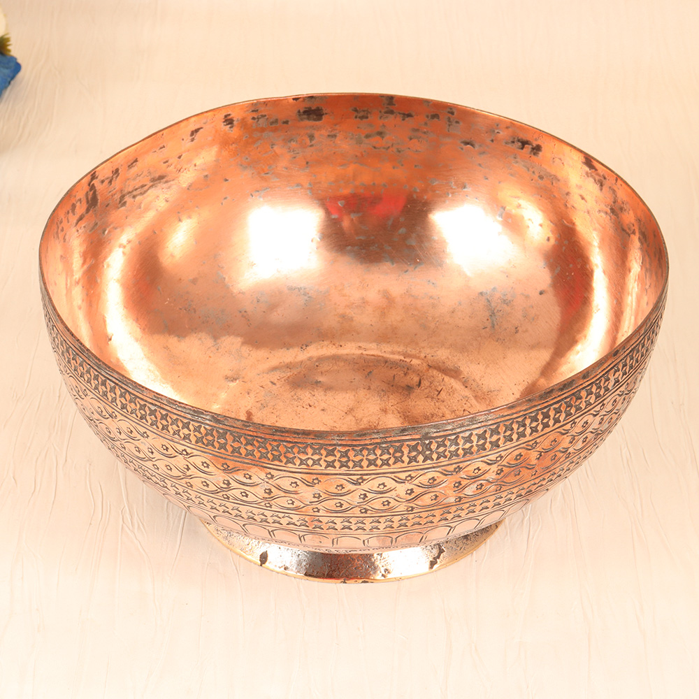 Embark on a journey through the rich cultural heritage of the Islamic world with this exquisite copper bowl, a stunning masterpiece of Peshawari art. Crafted with meticulous attention to detail by skilled artisans, this vintage treasure is a true testament to the enduring beauty and craftsmanship of the Islamic tradition. Whether you're a collector of fine Islamic art or simply seeking to infuse your environment with the captivating allure of Peshawari craftsmanship, this copper bowl is a must-have addition to your home or office. Its striking appearance and functional versatility make it a true centerpiece that will elevate your décor and inspire all who behold it. Unlock the beauty and history of the Islamic world with this exquisite copper bowl. Immerse yourself in the timeless artistry of Peshawari design and let this remarkable piece transport you to a world of cultural richness and elegance. Transform your space and experience the captivating essence of Islamic heritage with this stunning centerpiece.