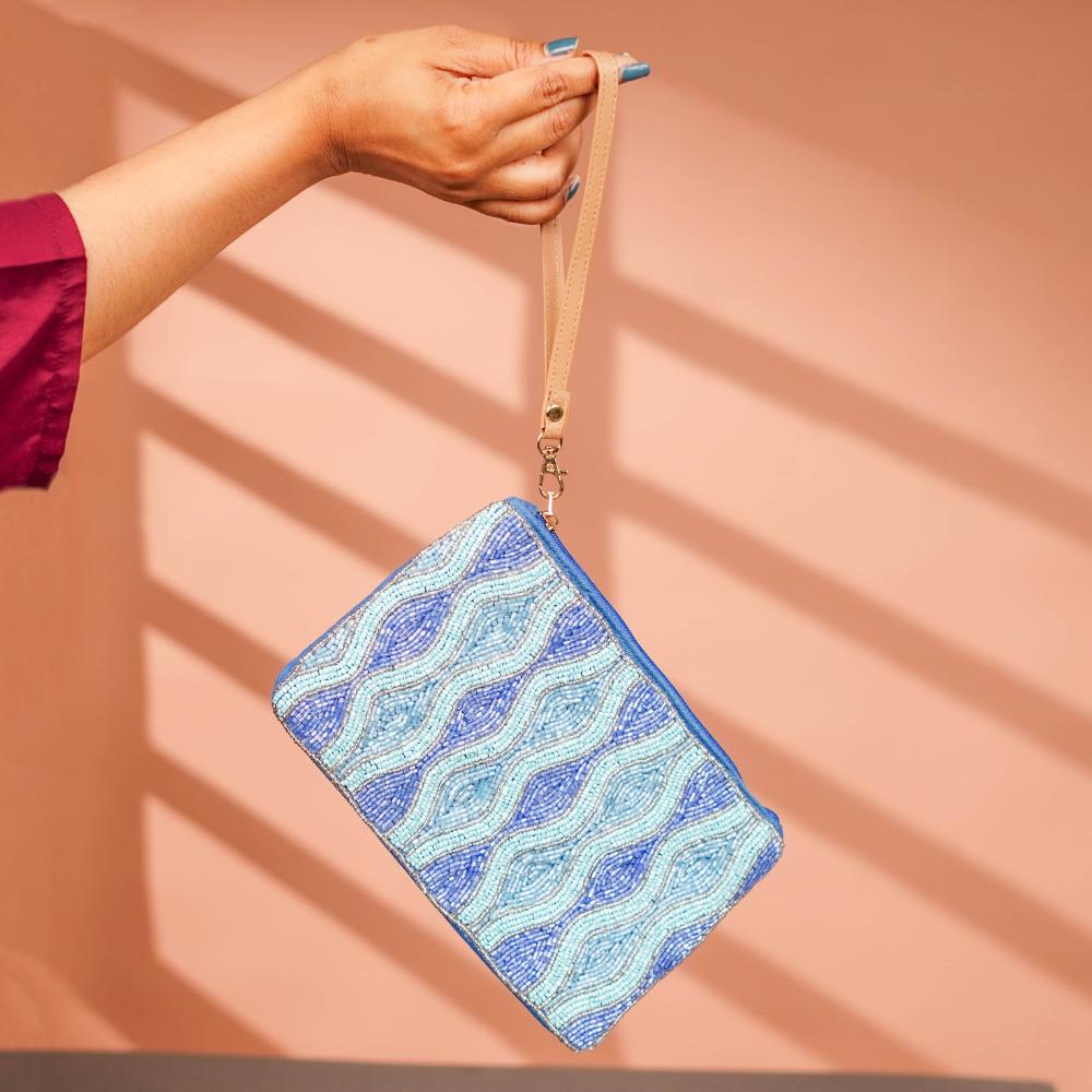 Modern minimalism meets vibrant detail in this sleek blue cotton and beads clutch. The visually captivating wave design uses gradient blues and silver bead accents to create movement and style. Compact yet expressive, the bag’s zipper closure keeps your essentials secure, while the tan wrist strap offers both comfort and convenience. It's a fresh, wearable accessory for any fashion-forward wardrobe.