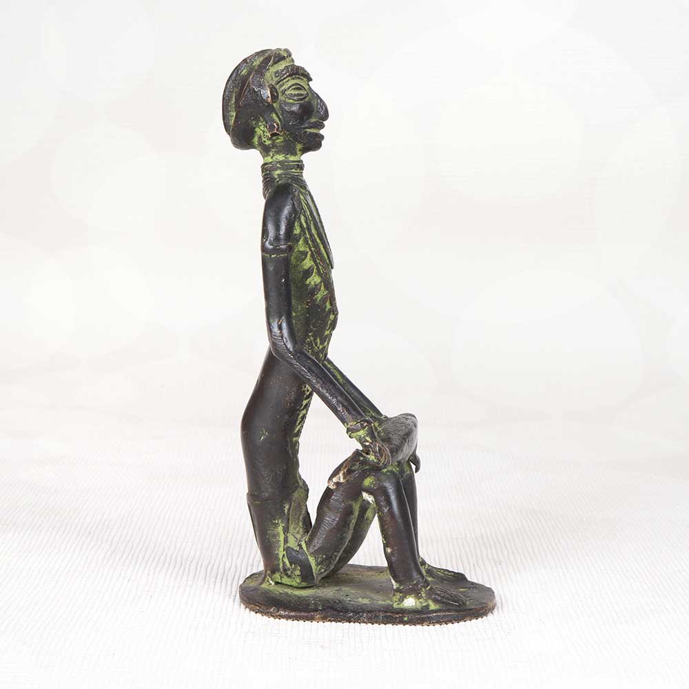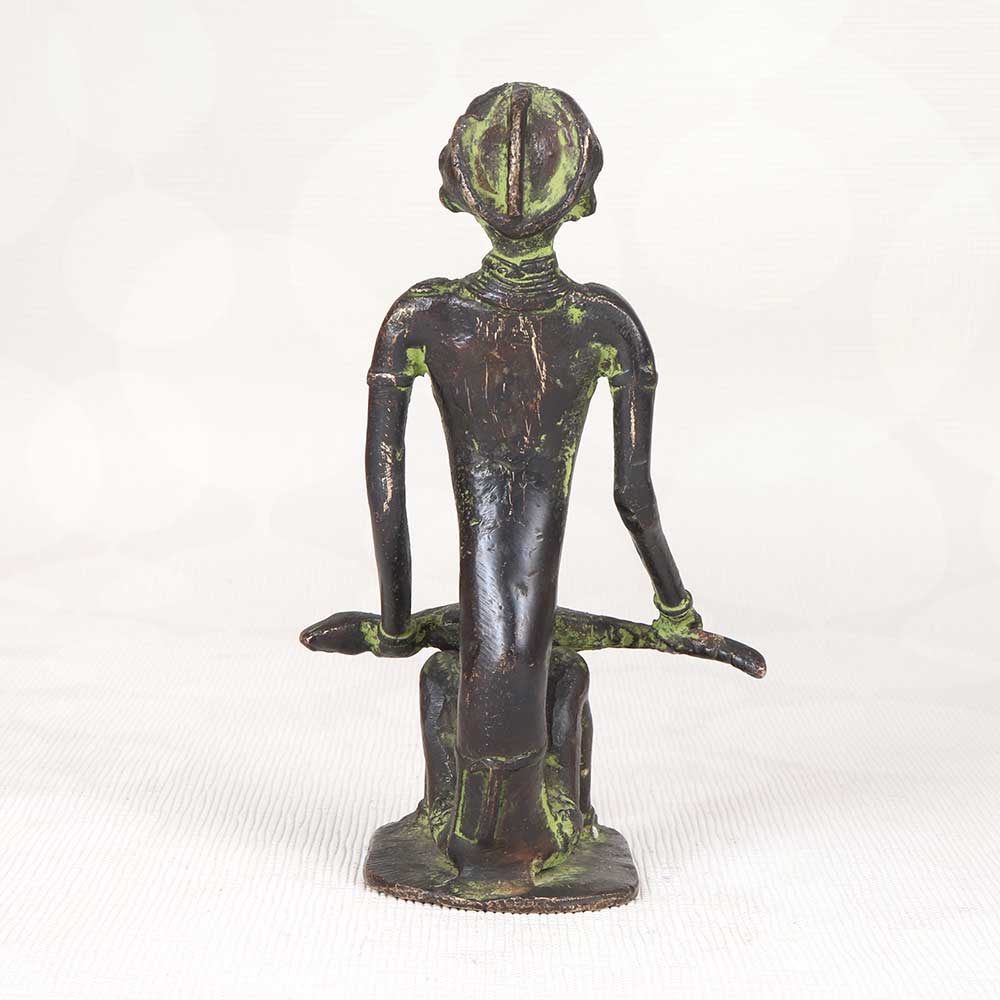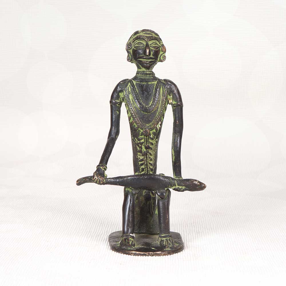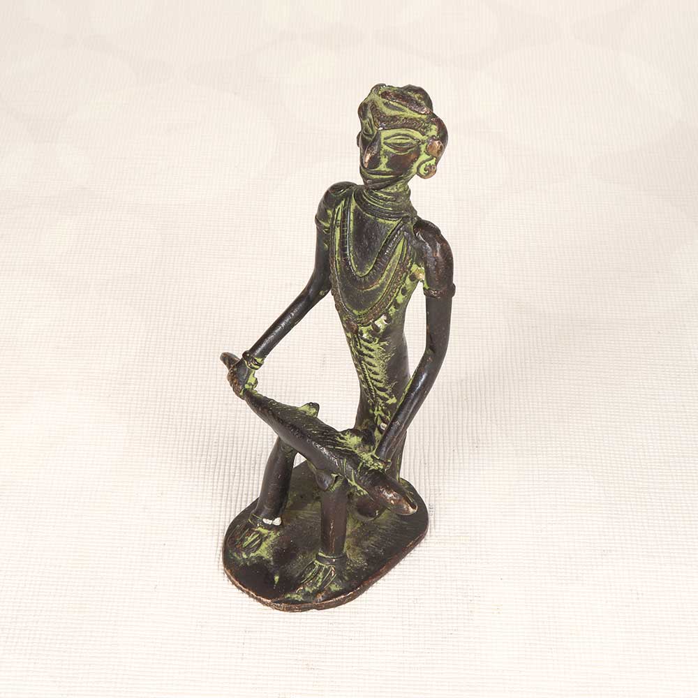 Make a statement in your home decor with this striking vintage brass statue depicting a tribal man from India's Bastar region holding a large fish across his lap. Expertly cast with exquisite handcrafted details, this statue brings Bastar's one-of-a-kind tribal artistry to your home. This tribal man statue is an ode to the rich artistic heritage of Bastar's indigenous tribes. The distressed finish adds vintage character that makes it seem like a global antique. With its intricate tribal designs and cultural motifs, this statue makes a striking decorative accent for console tables, bookshelves, countertops, and more. Let this brass tribal man statue infuse faraway lands into your living space. Its earthy presence is sure to draw the eye and spark conversations about its origins and craftsmanship. For an exotic statement piece, look no further than this vintage Bastar artwork.