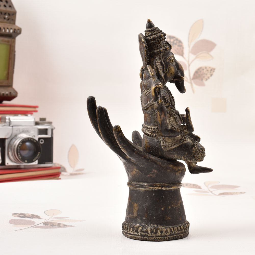 - Ganesha, the remover of obstacles, sits atop a hand-sculpted hand base for a captivating display