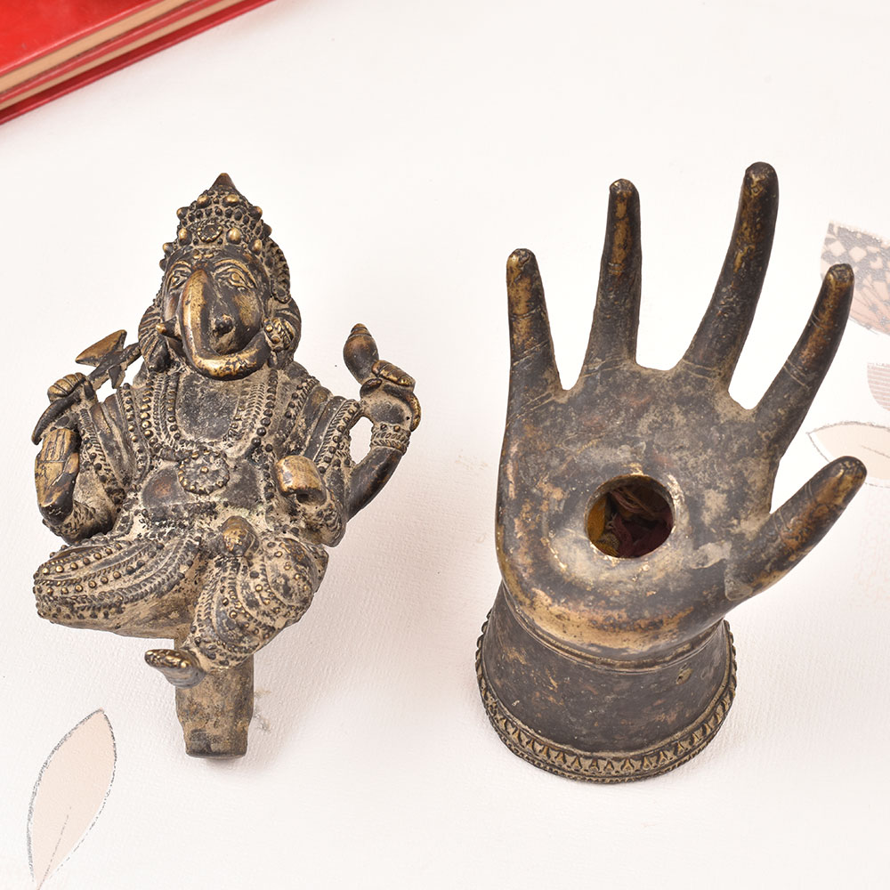 Discover the captivating essence of ancient Indian artistry with our exquisite Vintage Brass Tribal Lord Ganesha Statue. Meticulously crafted by skilled artisans in the heart of Central India, this stunning piece embodies the divine wisdom and unwavering protection of the revered Hindu deity, Lord Ganesha. Elevate the ambiance of any room with the captivating presence of this Vintage Brass Tribal Lord Ganesha Statue. Its timeless elegance and profound symbolism will inspire a sense of balance, prosperity, and inner peace, making it a cherished addition to your living or working space. Embrace the rich cultural heritage of India and allow this magnificent piece to become a centerpiece of your home, imbuing it with the blessings and protection of the revered Lord Ganesha.