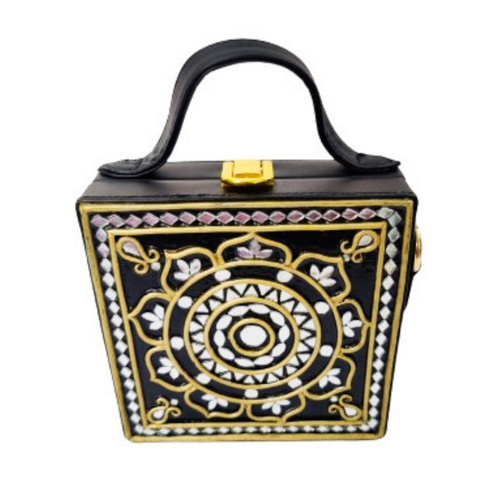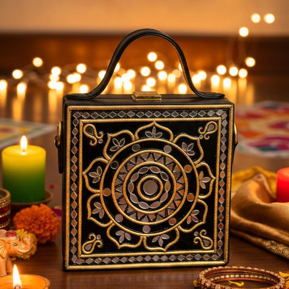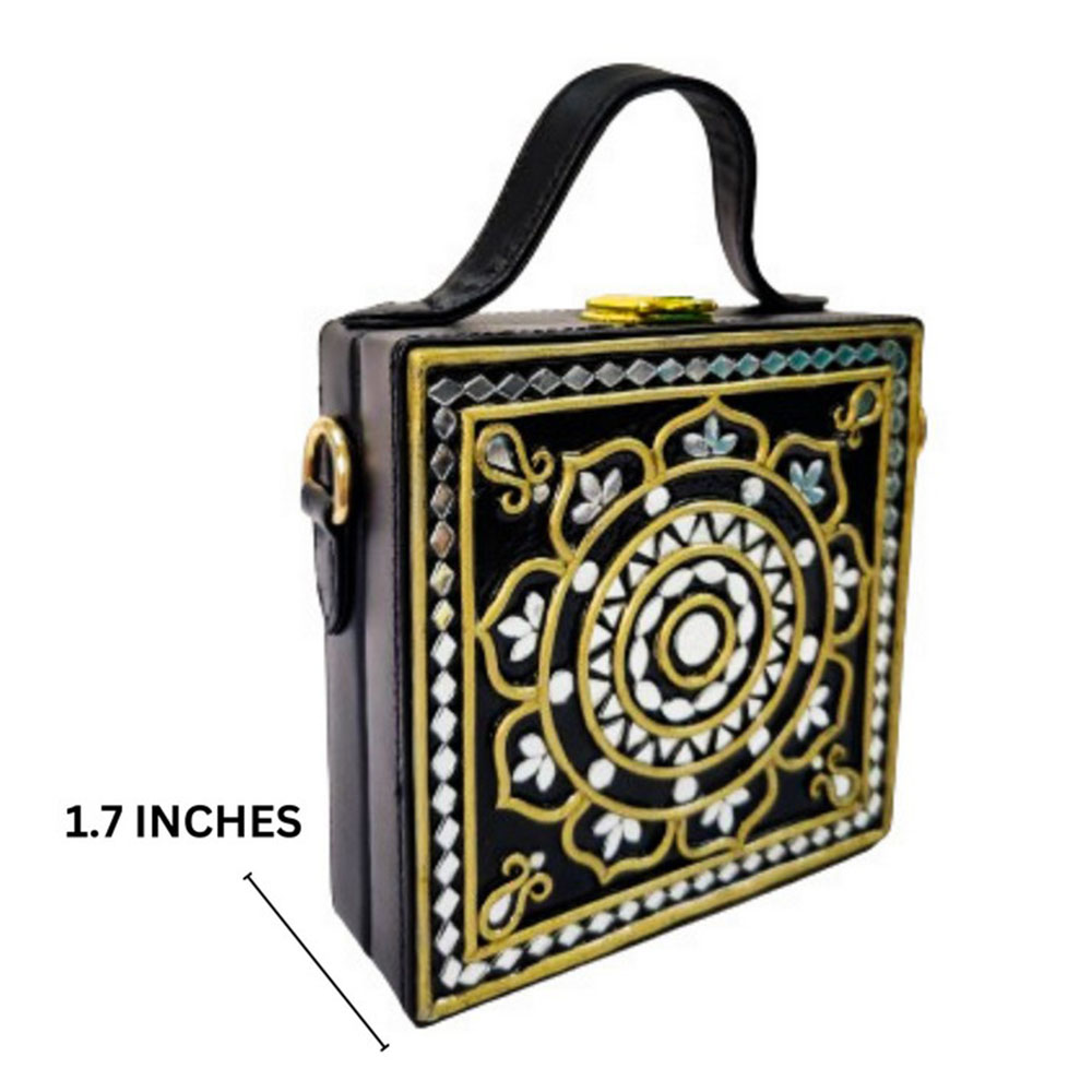 This mini sling box bag showcases black inspired Lippan art that blends tradition with modern style. Its compact box form and mirrored details make it appealing to collectors decorators and gifters alike. Each piece is handcrafted by skilled artisans and packed and quality checked by Indianshelf.Black Glamour HighlightsThis charming piece features black motifs in fine Lippan art appealing to those who love unique cultural accessories and those seeking meaningful gifts.Ornate Lippan art and mirrors create a glamorous black statement.Entirely handmade and never machine madeSolid build makes it reliable for regular outings and decor.Composition and Structure Origin: India. Safely packed and quality checked by Indianshelf Soft strap and light body provide comfort while worn.Usage PossibilitiesUse as a unique accessory at home or out to showcase the glamour motif.Gift this glamour themed bag for festivals birthdays or special celebrations.Enhance boutique displays with its artisanal glamour design to attract customers.Event planners and collectors can use it as an eye catching cultural accent piece.Upkeep AdviceFor the glamorous black bag keep it free from moisture and wipe it gently with a clean cloth. Avoid chemicals and store it safely to preserve the ornate Lippan art and mirrors.Your Questions AnsweredHow is the glamorous look achieved?The glamorous appeal comes from the black finish and intricate Lippan art applied by hand.Is this black box bag practical for everyday wear?Despite its ornate style it is built for daily use with a sturdy body.What can I store in this mini piece?It holds small essentials such as cards cash and small makeup items.Is the strap length adjustable?Yes the sling strap adjusts to suit different heights and preferences.Artisan AcknowledgmentEvery piece reflects heritage artistry and careful attention to detail. All our products are handmade never machine made ensuring individuality.
