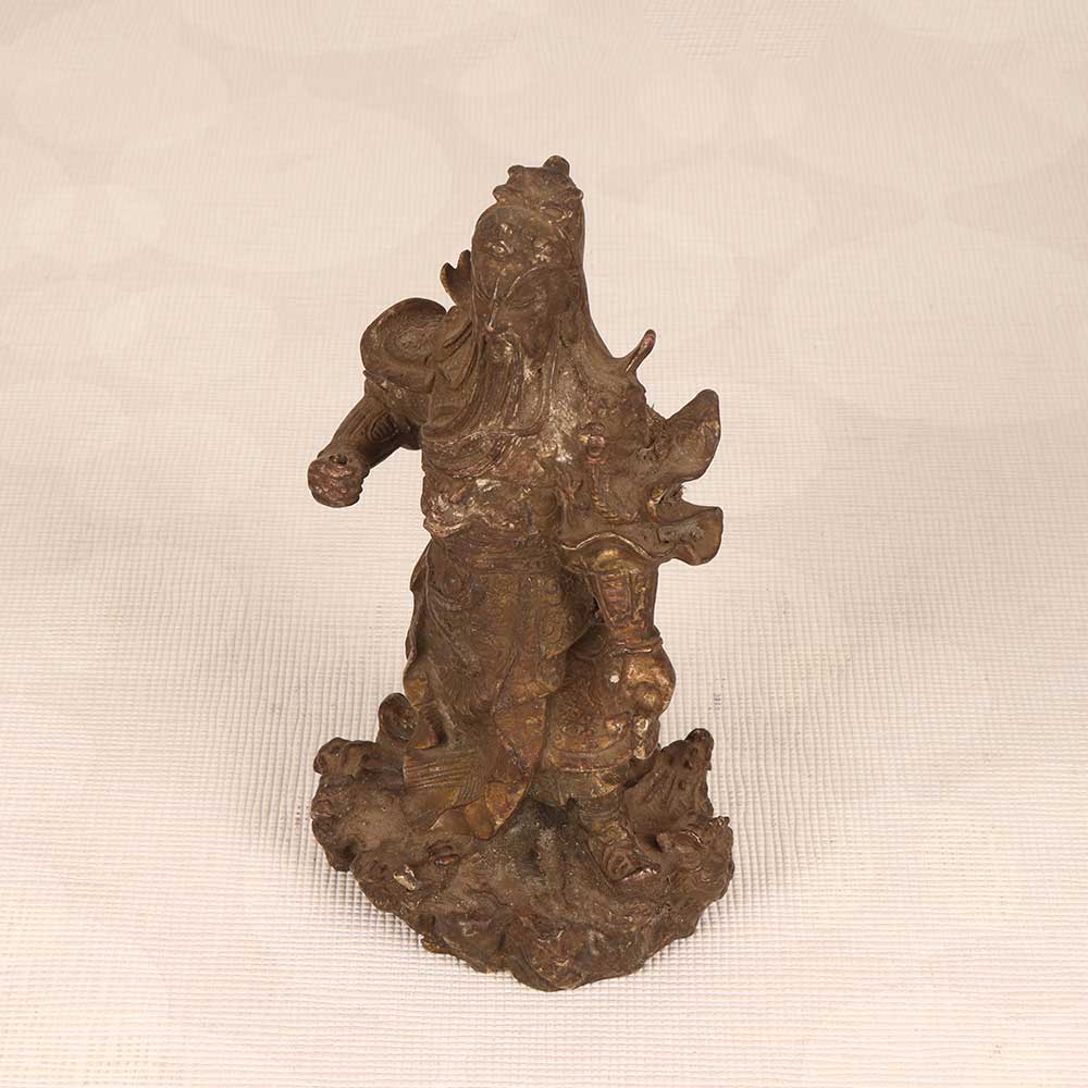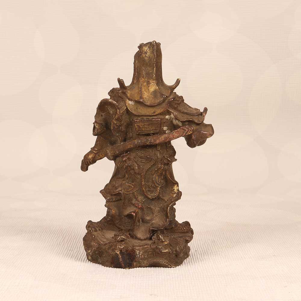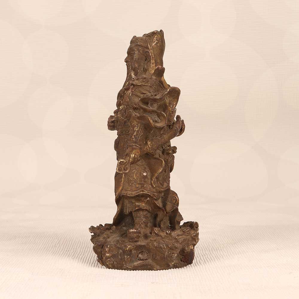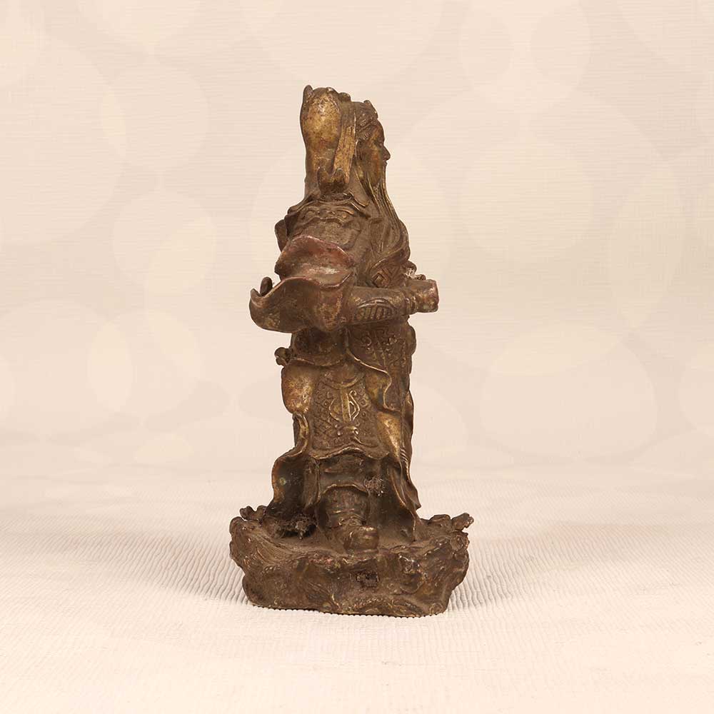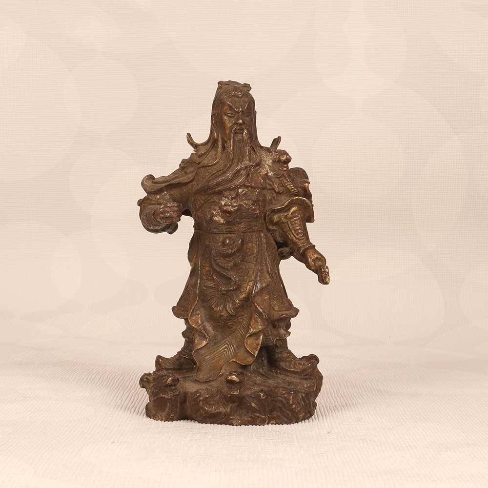 With fiery eyes peering from beneath his ornate headdress, this commanding Guan Gong Warrior Statue in antiqued brass showcases the legendary general's strength and moral character. Revered as a paragon of loyalty and righteousness, General Guan Gong is one of the most iconic figures in Chinese history. This finely crafted brass likeness honors his legend with vivid detail and palpable power emanating from his stance. The aged patina on the vintage brass gives this masterful replica a museum-quality feel. It makes a breathtaking statement piece whether displayed on its own or as part of a collection. For admirers of Chinese culture, martial arts, or commanding historical statuary, this Guan Gong Warrior Statue is a must-have antique-style sculpture. Let his strength and moral presence fill your home - an inspiring symbol of loyalty and bravery through the ages.