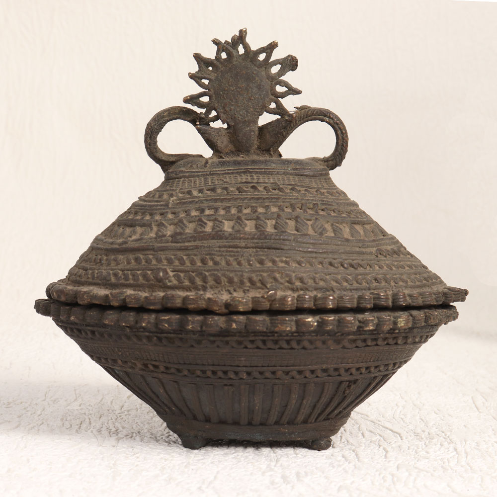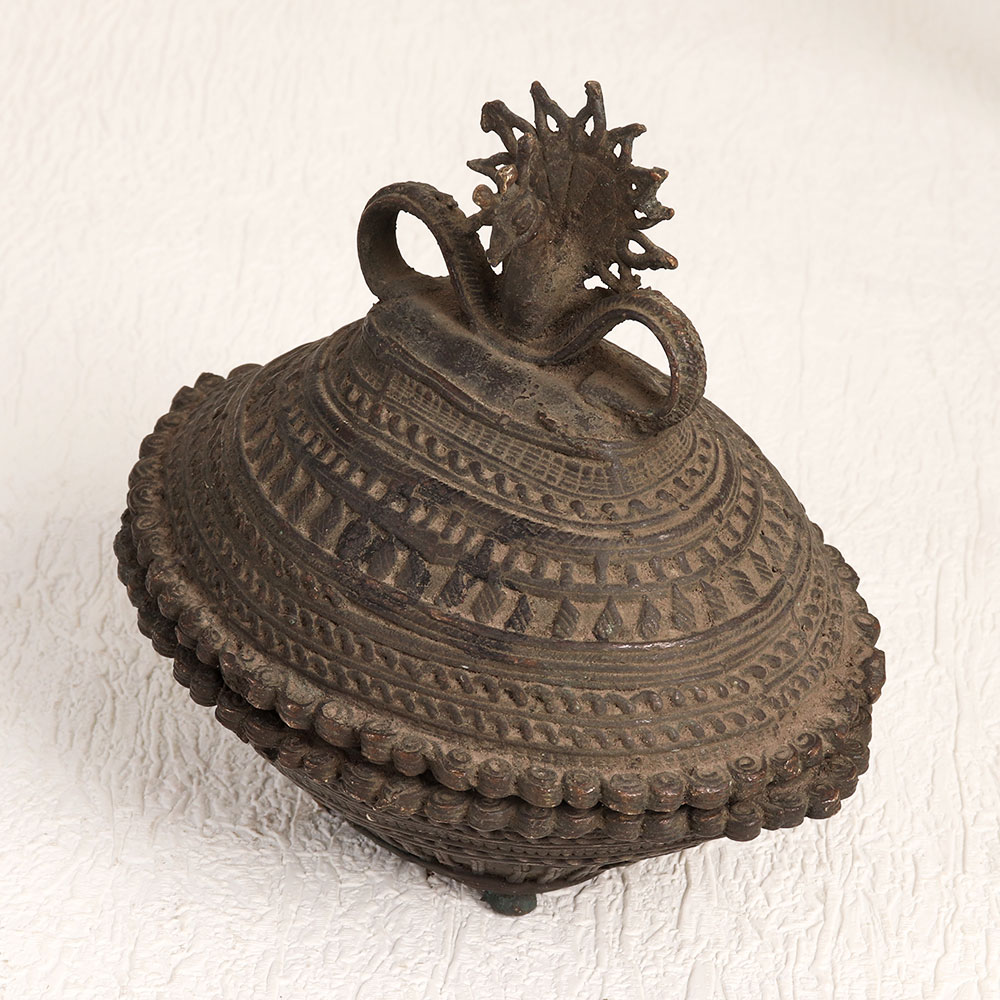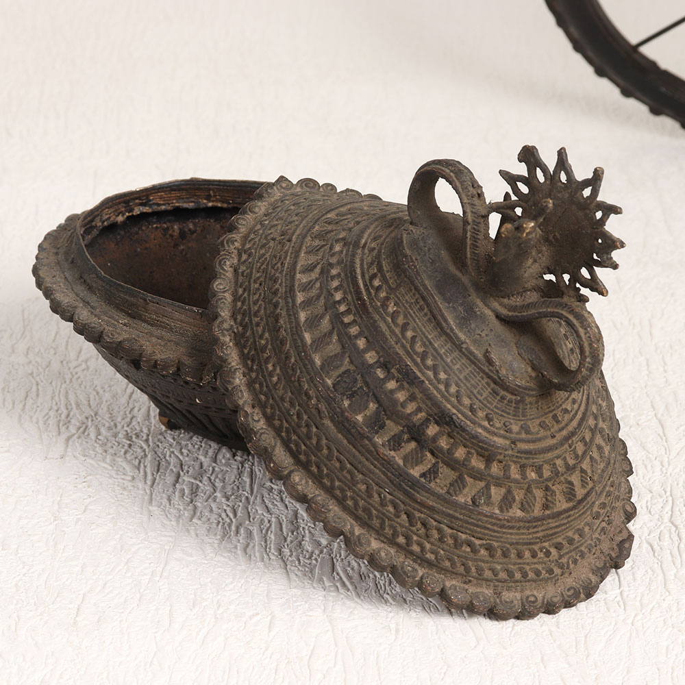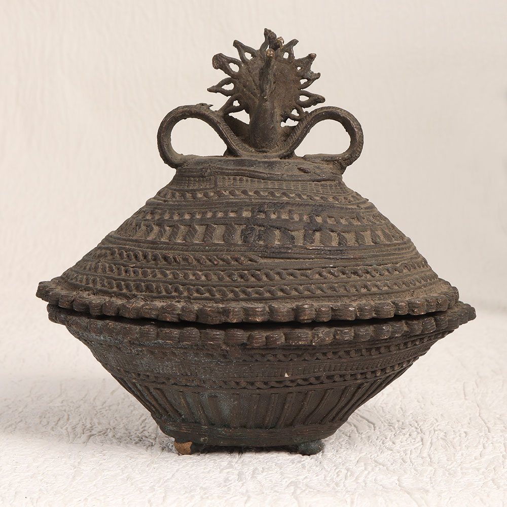 This Vintage Brass Prayer Kumkum Box in an oval shape is a masterpiece adorned with a finely carved peacock on its lid, showcasing impeccable Tribal Art craftsmanship. Crafted by professional artisans, this remarkable piece boasts a rich antique dark finish, exuding an aura of timeless elegance. Handcrafted with precision and care, using only the finest quality brass, this kumkum box serves a multitude of purposes. Whether gracing your home, office, restaurant, hotel, cafe, or shop, it serves as both a captivating decorative element and a symbol of spiritual devotion. It's more than just an accessory, it's a testament to craftsmanship, spirituality, and timeless beauty. This versatile artefact is not only a valuable addition to your vintage collection but can also steal the limelight at exhibitions and displays. Its unique charm makes it an ideal gift for your family, friends or relatives on special, festive, or auspicious occasions, symbolizing your appreciation for their spirituality and aesthetics.
