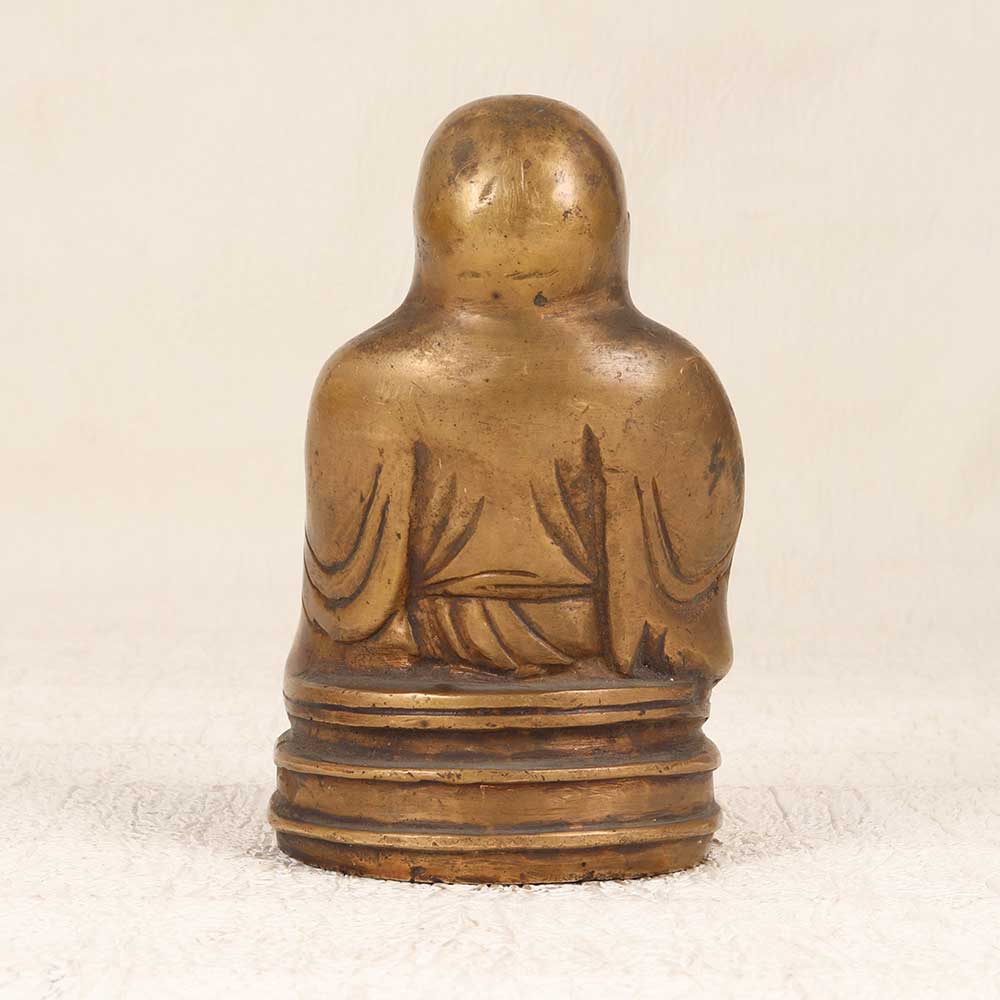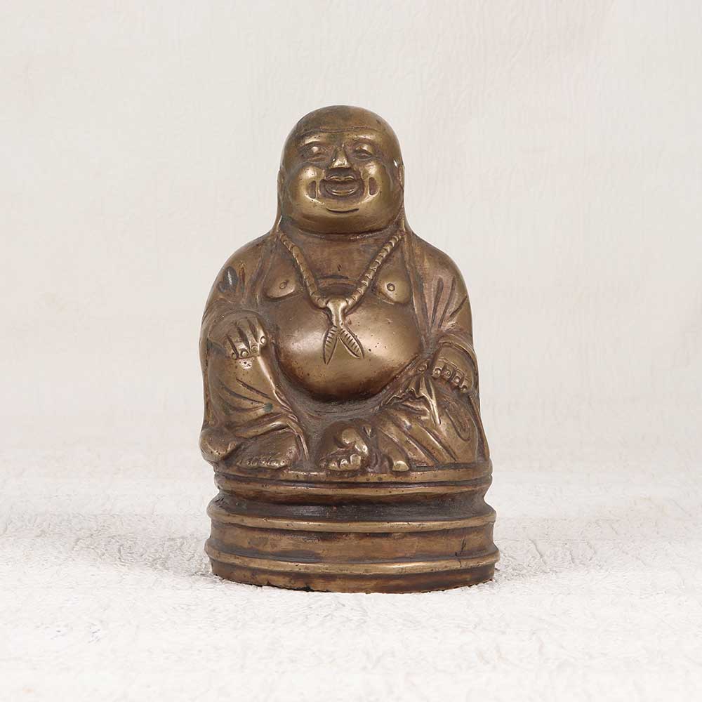 Bring wealth, joy and harmony into your home with this finely crafted vintage brass Laughing Buddha. Meticulously cast in aged brass with exquisite detail, this Chinese Feng Shui icon makes an auspicious addition to any room. In Chinese culture, the Laughing Buddha symbolizes enlightenment, prosperity and wisdom. His cheerful rotund belly represents a life of contentment, free from want or need. Displaying a Laughing Buddha attracts good luck and fortune, making it a popular Feng Shui decor item. Place this vintage statue on your office desk or home altar to invite financial success and positive energy. Let his warm aged brass finish and delighted expression uplift your mood and outlook whenever you see him.
