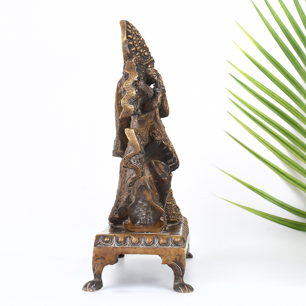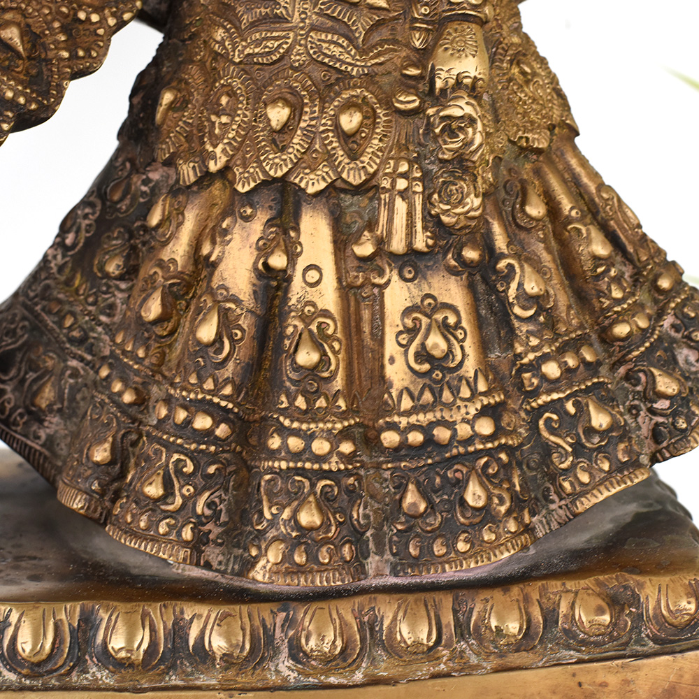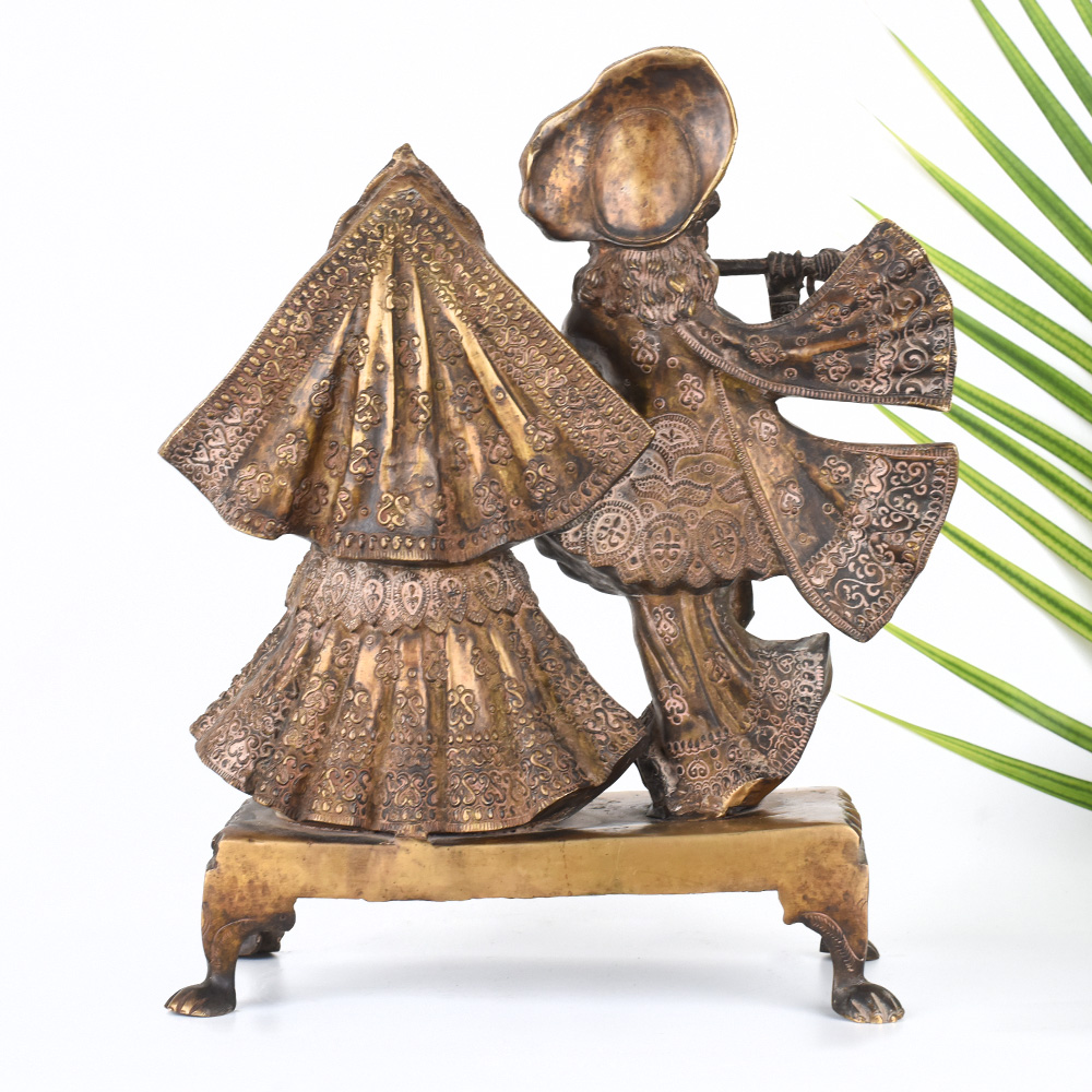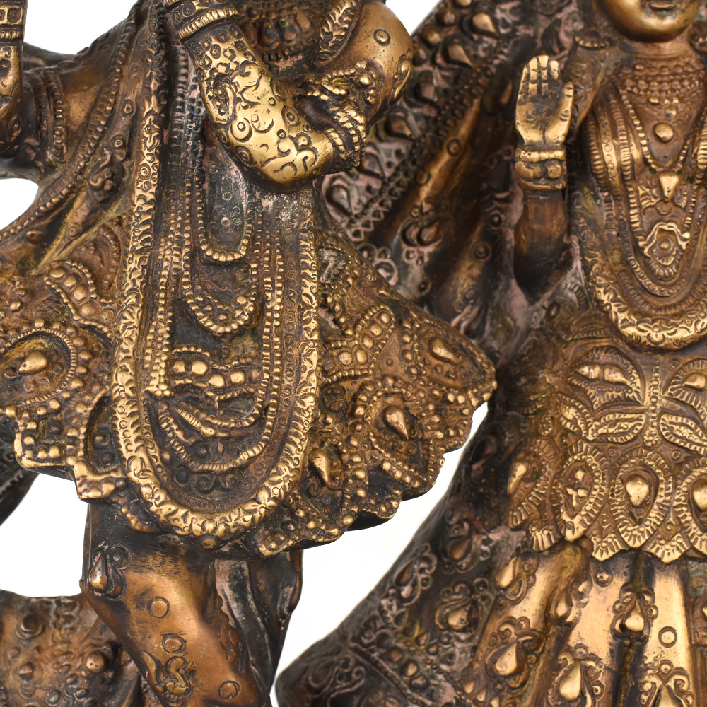 Bring the divine love of Lord Krishna and Radha into your home with this exquisite vintage brass statue. Crafted with meticulous detail by skilled artisans in Northern India, this stunning piece will captivate all who behold it. This vintage brass statue celebrates the eternal, transcendent love between Lord Krishna and his divine consort, Radha. Their intertwined embrace radiates a palpable spiritual energy, inviting you to bask in the glow of their divine union. As you gaze upon this exquisite work of art, you'll be transported to the lush forests of Vrindavan, where Krishna and Radha's love blossomed. Invite the blessings and positive energy of this revered Hindu deity into your sacred space. Whether you're a devoted Krishna devotee or simply appreciate fine Indian art, this vintage brass statue will elevate your décor and nourish your soul. Display it proudly in your prayer room, meditation corner, or any area that calls for a touch of timeless, spiritual beauty.
