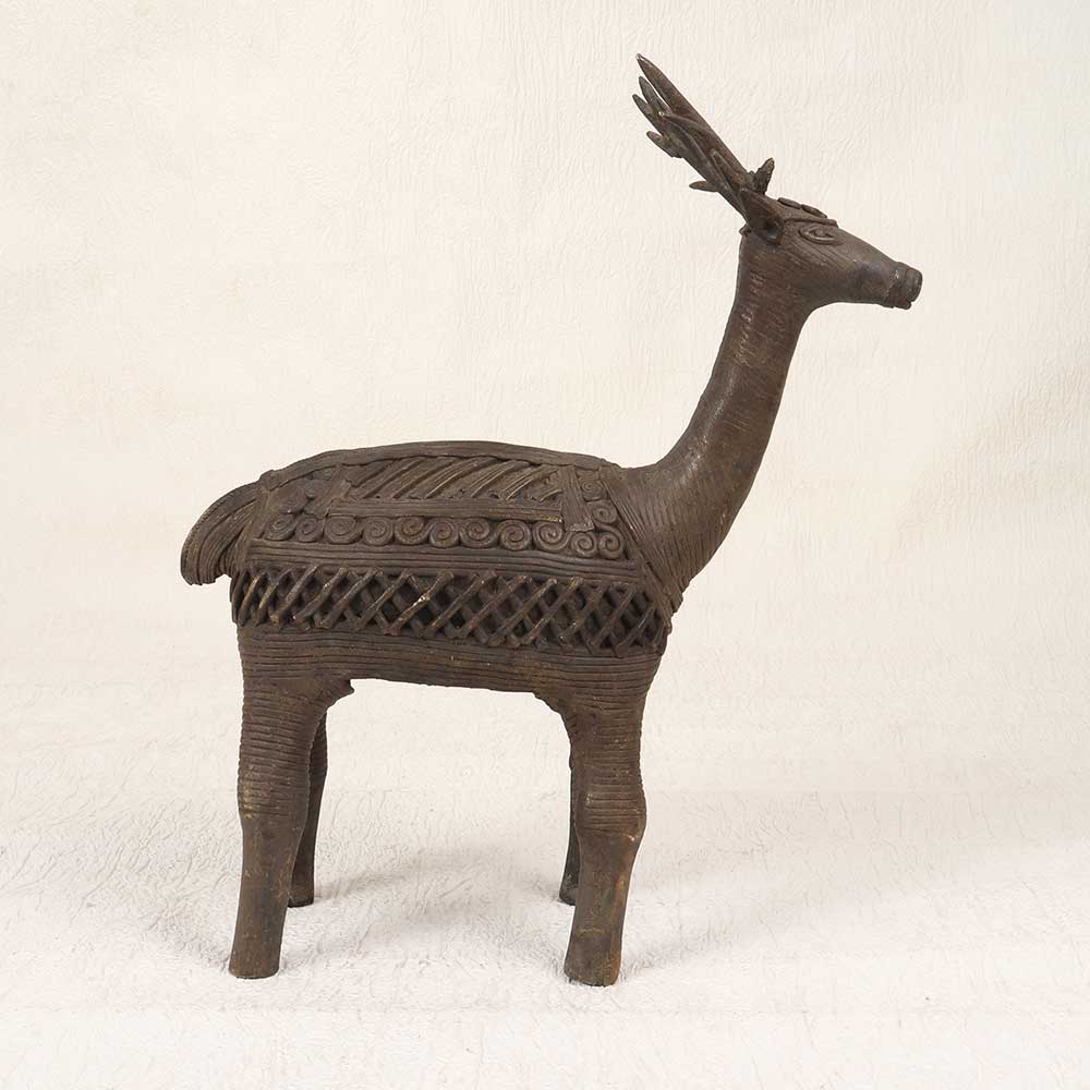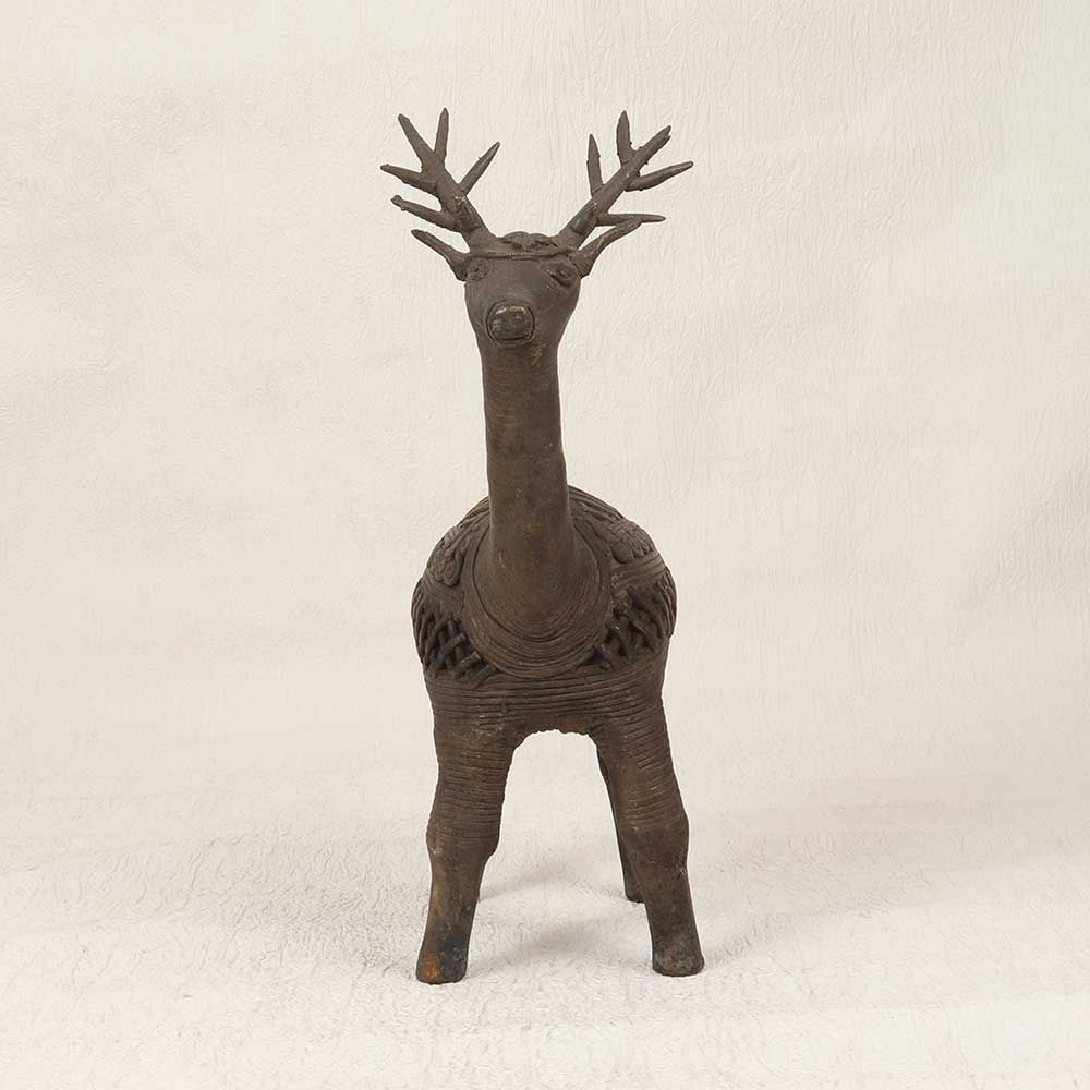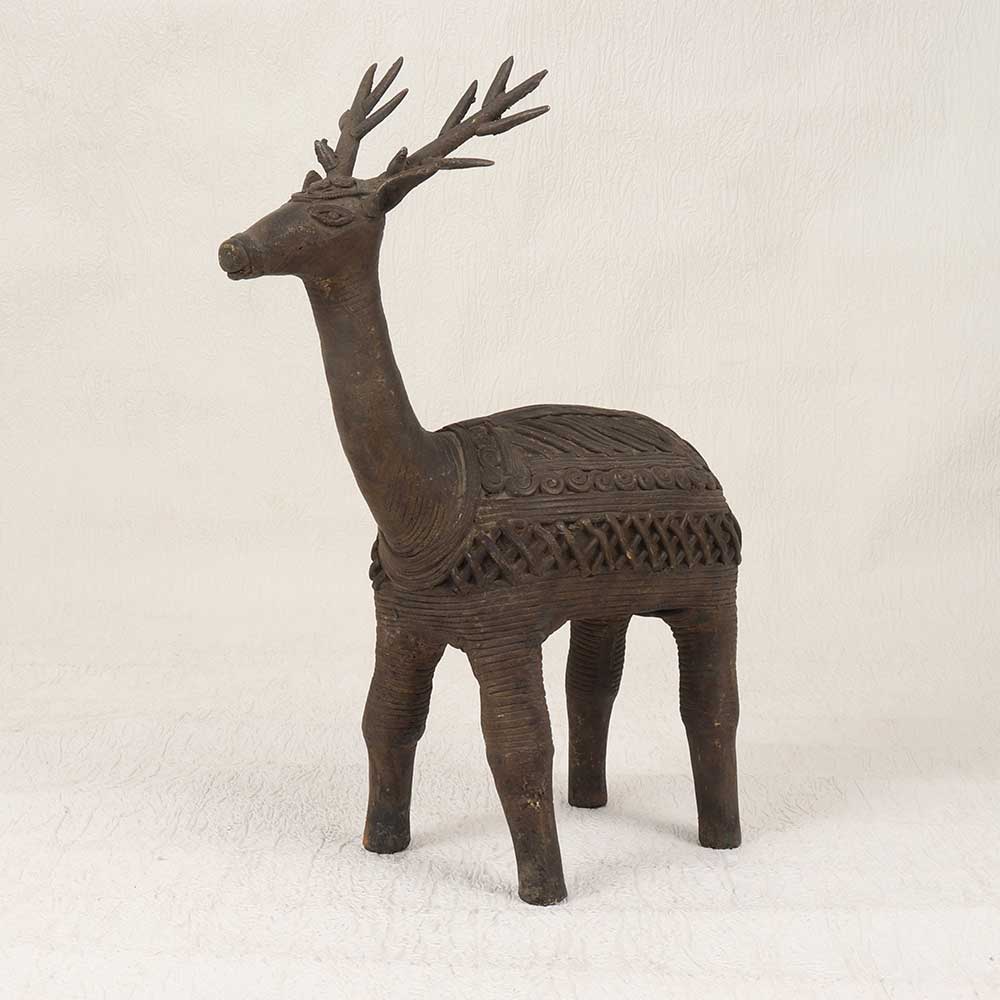 Revel in the intricate details of this Vintage Brass Standing Deer, a striking Indian tribal art piece unlike any other. Skilled Bastar artisans sculpted and cast this solid brass accent to bring natural elegance to you. This deer is destined to become a statement piece in your home. Its rich, antiqued brass finish and fluid form spark visual interest. Let it inspire a sense of simple serenity as it introduces a touch of wilderness to your personal retreat. Bring a dose of global artisan style to your space with this Vintage Brass Standing Deer. No two are exactly alike, thanks to the handcrafted Bastar tribal artistry infused in each. Its sculptural form and brushed brass patina make it ideal for spotlighting. Let this Indian brasswork deer sculpture instill calm and connection. A handmade treasure, crafted to elevate your decor for years to come.