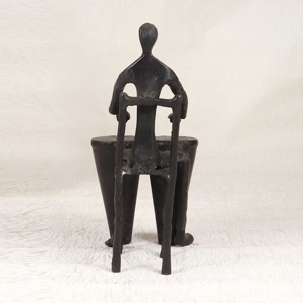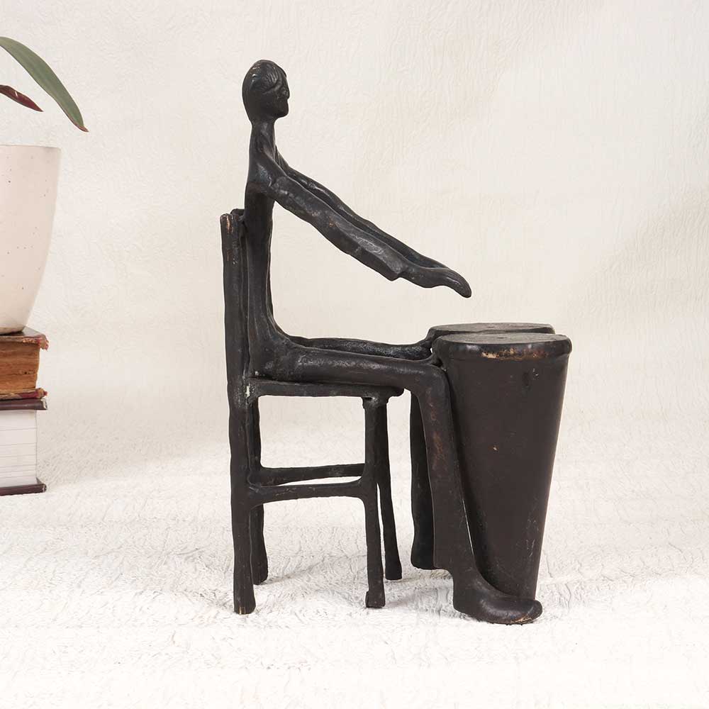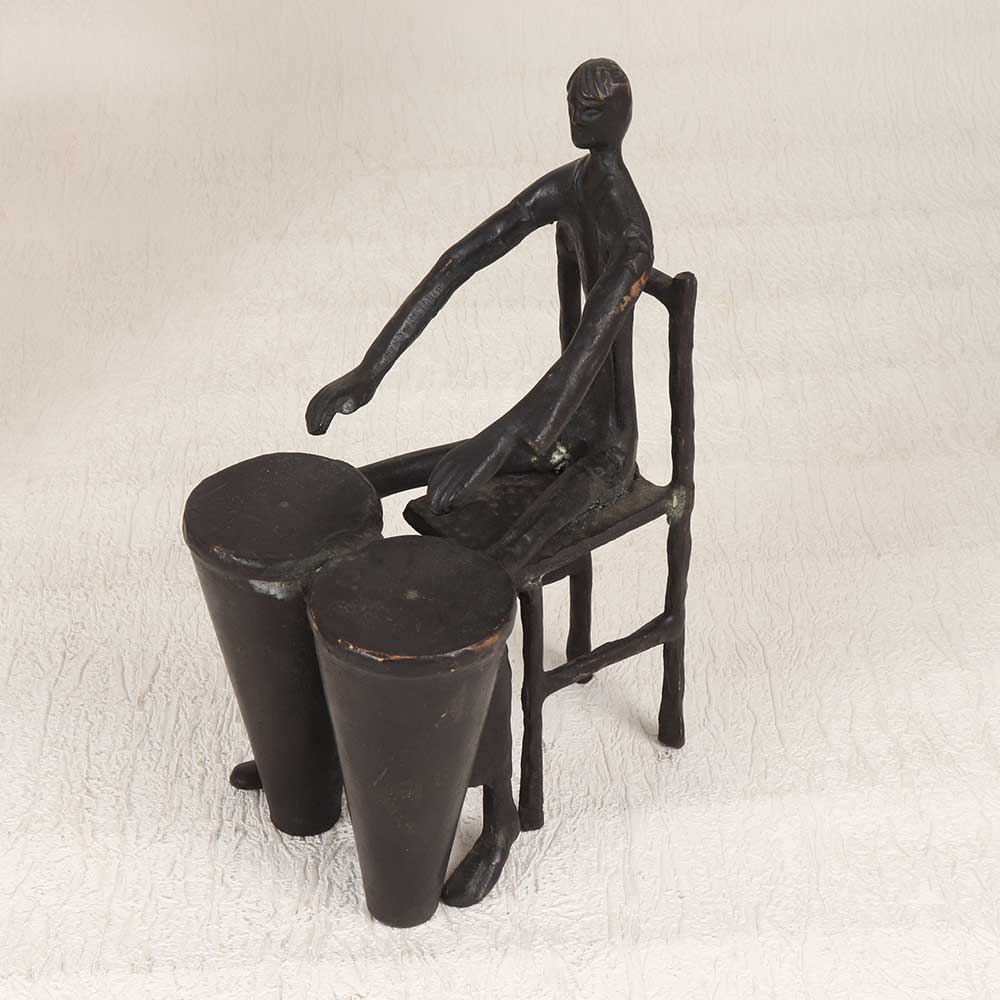 This vintage brass statue spotlights a big band drummer, mid-solo with eyes closed as he energetically pounds out the beat on his two bass drums. Expertly cast with crisp detailing, this statue captures the iconic musicality and showmanship of jazz drummers in the swing era. The statue depicts the drummer seated on a backless stool, drumsticks in hand as he plays the two large drums in front of him. He is adorned in a vintage three-piece suit and bow tie. The drums, stool, and figure are all crafted from solid brass and polished to a warm, bright finish that will shine for years to come. This is a must-have piece for jazz fans and music lovers! Place this statue on a shelf, desktop, or table to add bold vintage style and rhythmic charm to your home. Let the drummer's infectious beat enliven your decor and stir memories of the golden age of big bands. This finely detailed brass statue makes a unique addition to any music lover's home, capturing the style, showmanship, and sound of jazz drumming.