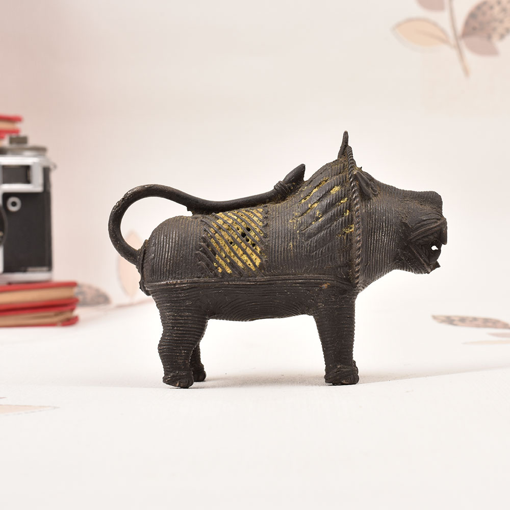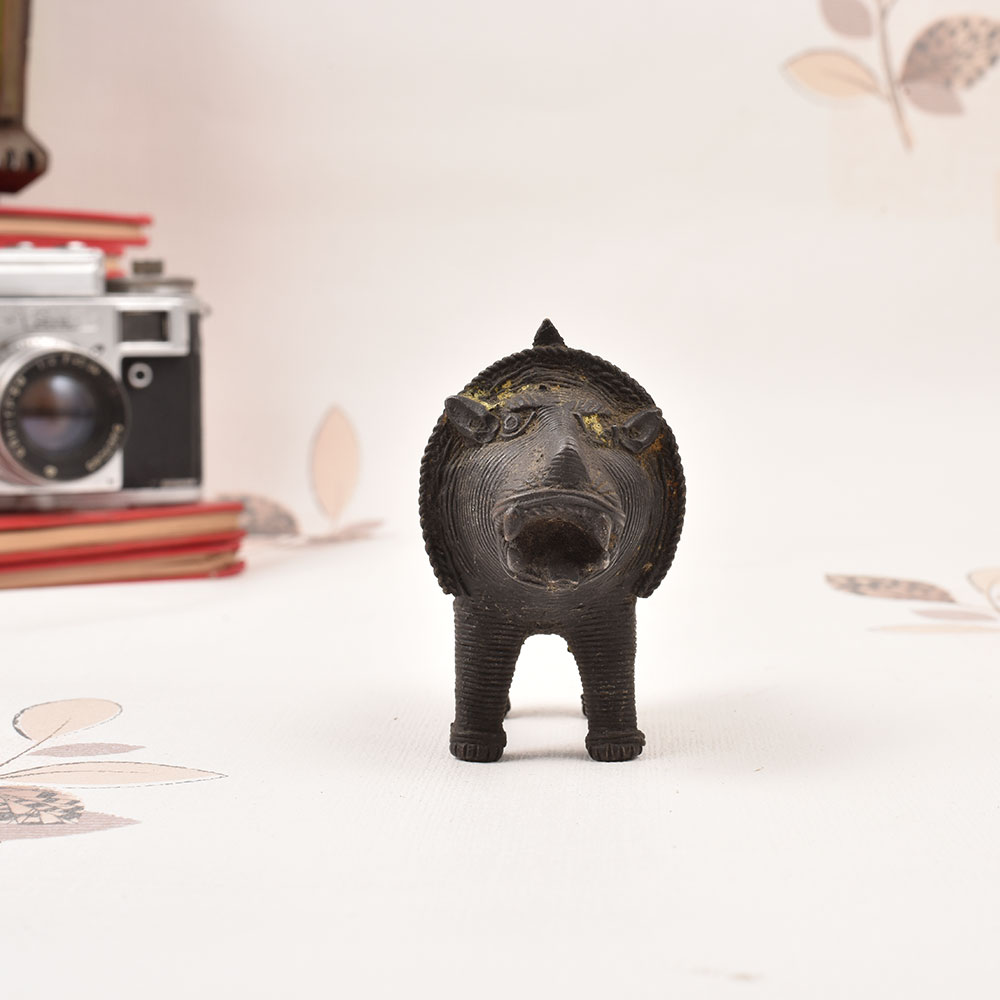 This stunning vintage brass tribal lion statue from Odisha Art is a captivating piece that commands attention in any space. Crafted with meticulous detail, this magnificent feline figure embodies the rich cultural heritage and artistic prowess of the Odisha region. Bring the untamed spirit of the wild into your living space with this impressive Odisha tribal lion statue. Its imposing presence will instantly elevate the ambiance, commanding attention and igniting the imagination. Whether displayed solo or alongside other global treasures, this brass masterpiece will transport you to the heart of India's vibrant cultural tapestry. This one-of-a-kind work of art is a must-have for anyone seeking to infuse their home with the exotic allure of the East. Showcase your refined aesthetic and appreciation for authentic craftsmanship with this stunning Odisha tribal lion statue - a true conversation piece that will captivate guests for years to come.