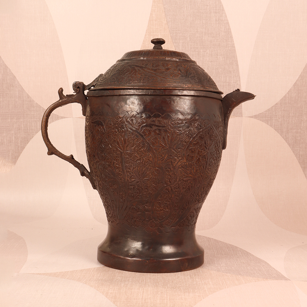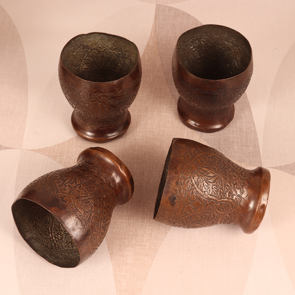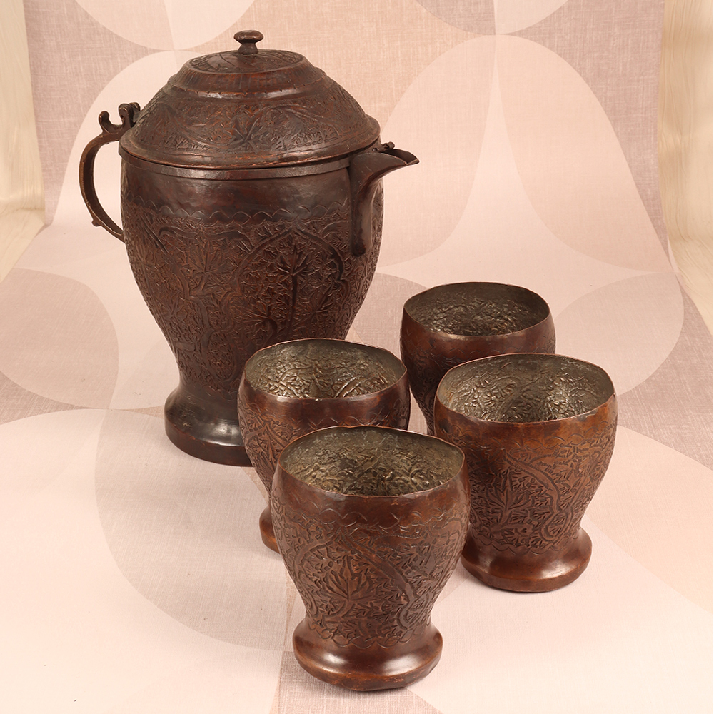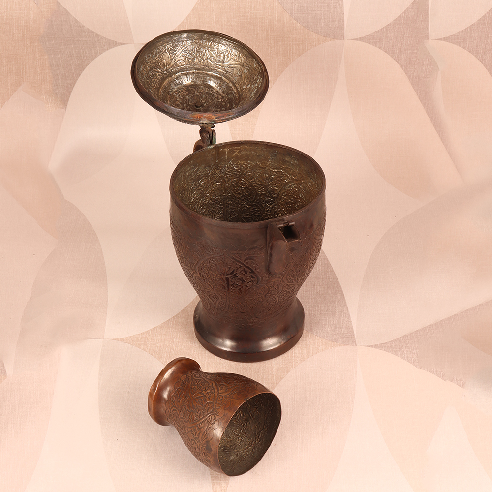 Unveil the captivating essence of Kashmiri Islamic Art with this exquisite vintage copper jug and four-glass set. Meticulously crafted, each piece in this collection is a masterpiece, imbued with the rich cultural heritage and artistry of Kashmir. This stunning set is a testament to the skilled craftsmanship of Kashmiri artisans, who have perfected the art of metalwork over generations. The vintage copper jug, with its mesmerizing patterns and motifs, serves as a captivating focal point, while the accompanying glasses add a touch of elegance to any tabletop or shelf. Whether you're a collector of unique home decor or simply seeking to infuse your living space with cultural richness, this vintage copper jug and glass set is a must-have addition. Elevate your home's ambiance and immerse yourself in the timeless beauty of Kashmiri Islamic Art, where every piece tells a story of centuries-old tradition and artistry.