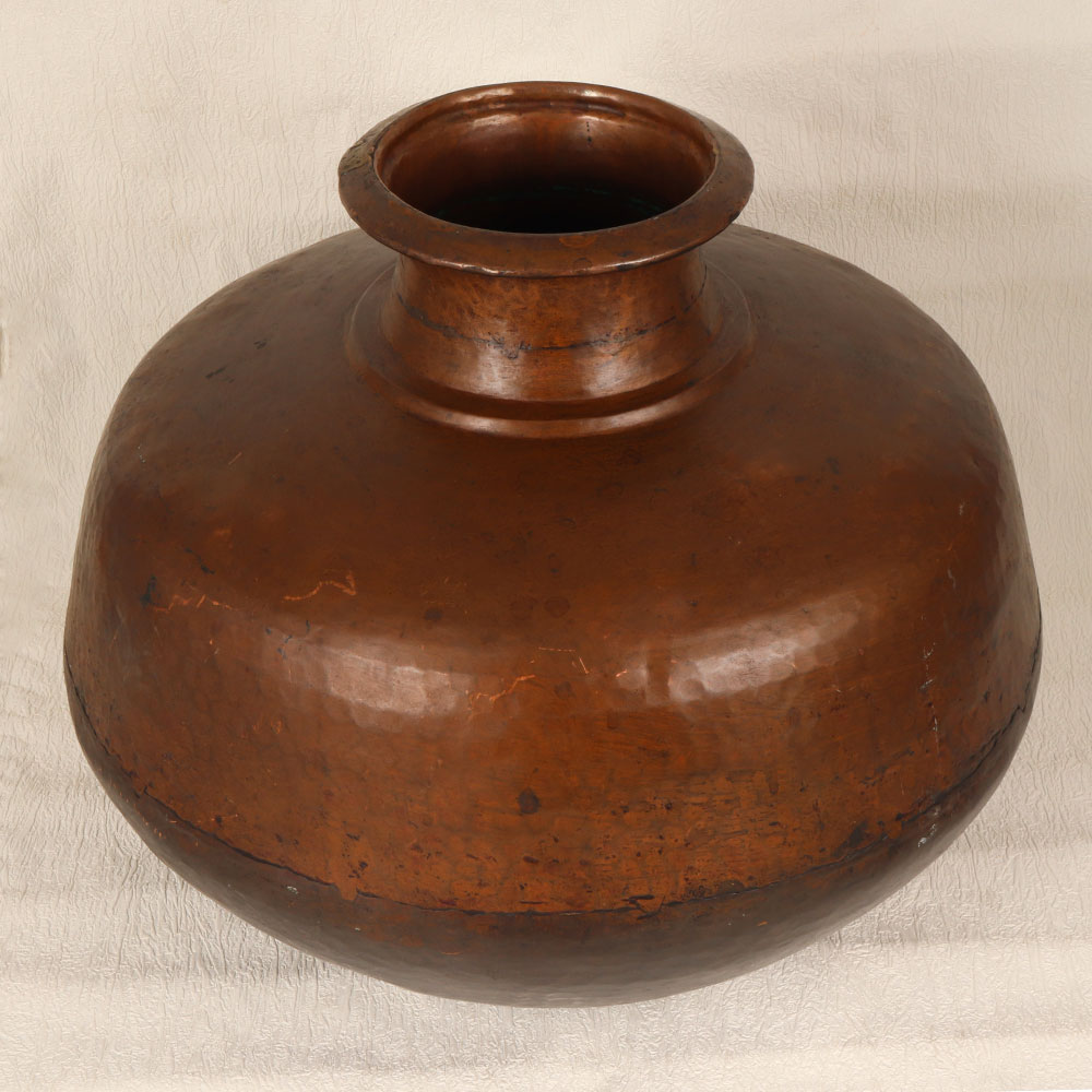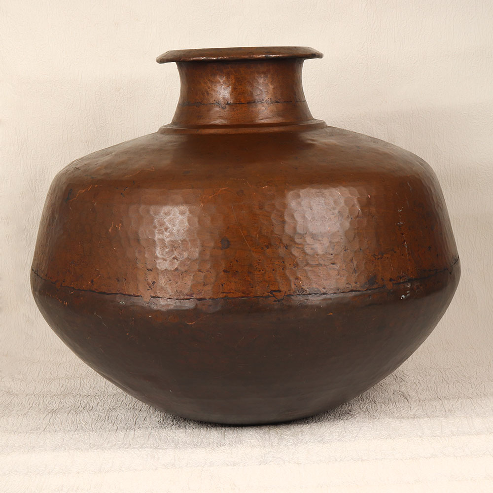 A Vintage Copper Water Pot with Nickel Plating which is a testament to the timeless beauty of Islamic Art crafted by highly talented Indian artisans. Handcrafted with precision and care, this unique piece showcases a small-mouthed design adorned with intricate hammered patterns, evoking the charm of a bygone era. Constructed from high-quality copper and elegantly plated with nickel, the pot exudes a lustrous antique brown finish, adding warmth and sophistication to any space. Its versatile design allows it to seamlessly integrate into various settings, making it a perfect addition to homes, offices, restaurants, hotels, or cafes. This multi-functional masterpiece serves as more than just a decor item; it doubles as an indoor flower pot, infusing nature's beauty into your surroundings. The pot's undeniable vintage appeal makes it a coveted item for collectors, while its cultural roots and meticulous craftsmanship make it an ideal gift for your family, friends or relatives on special, festive, or auspicious occasions.