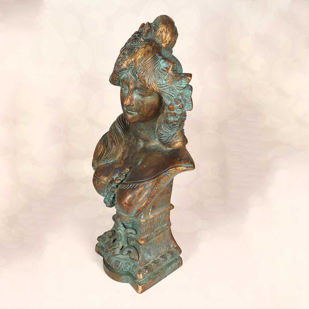 Make a striking decorative statement with this ornate vintage brass lady bust statue, meticulously sculpted to reflect the elegance of classic English style. Displaying a regal visage with upswept hair and draped garment, this imposing bust brings a refined presence to bookshelves, mantles and more. The weathered brass finish showcases ornate craftsmanship for an authentic antique look. For anyone looking to cultivate an ambiance of timeworn nobility and sophistication, this vintage-inspired lady bust lends an air of majesty and old-world charm. Let her watch over your living space as an elegant reminder of the splendor and refinement of past eras.