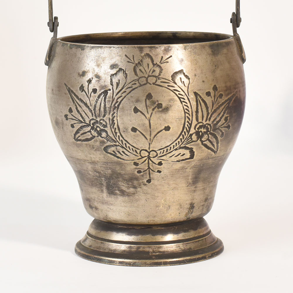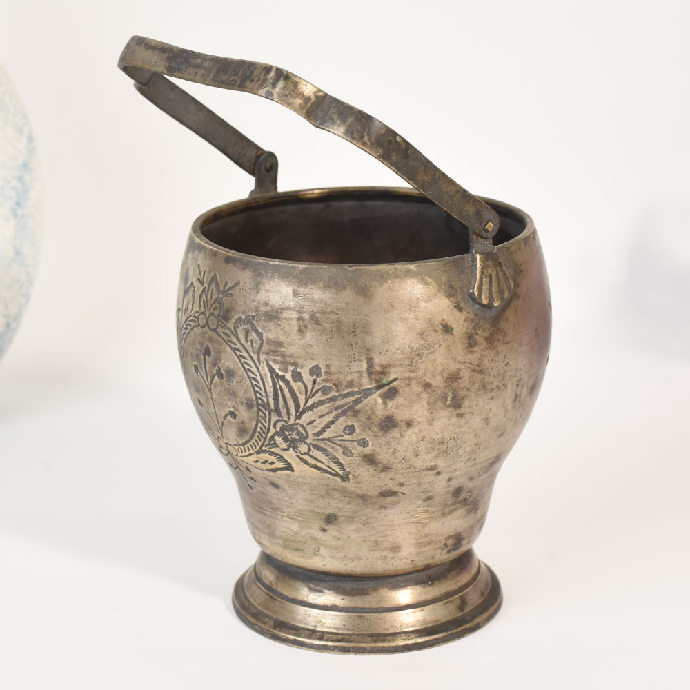 - Handmade vintage white metal bucket with English art floral engraving