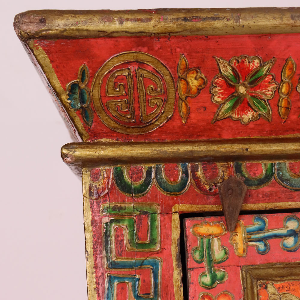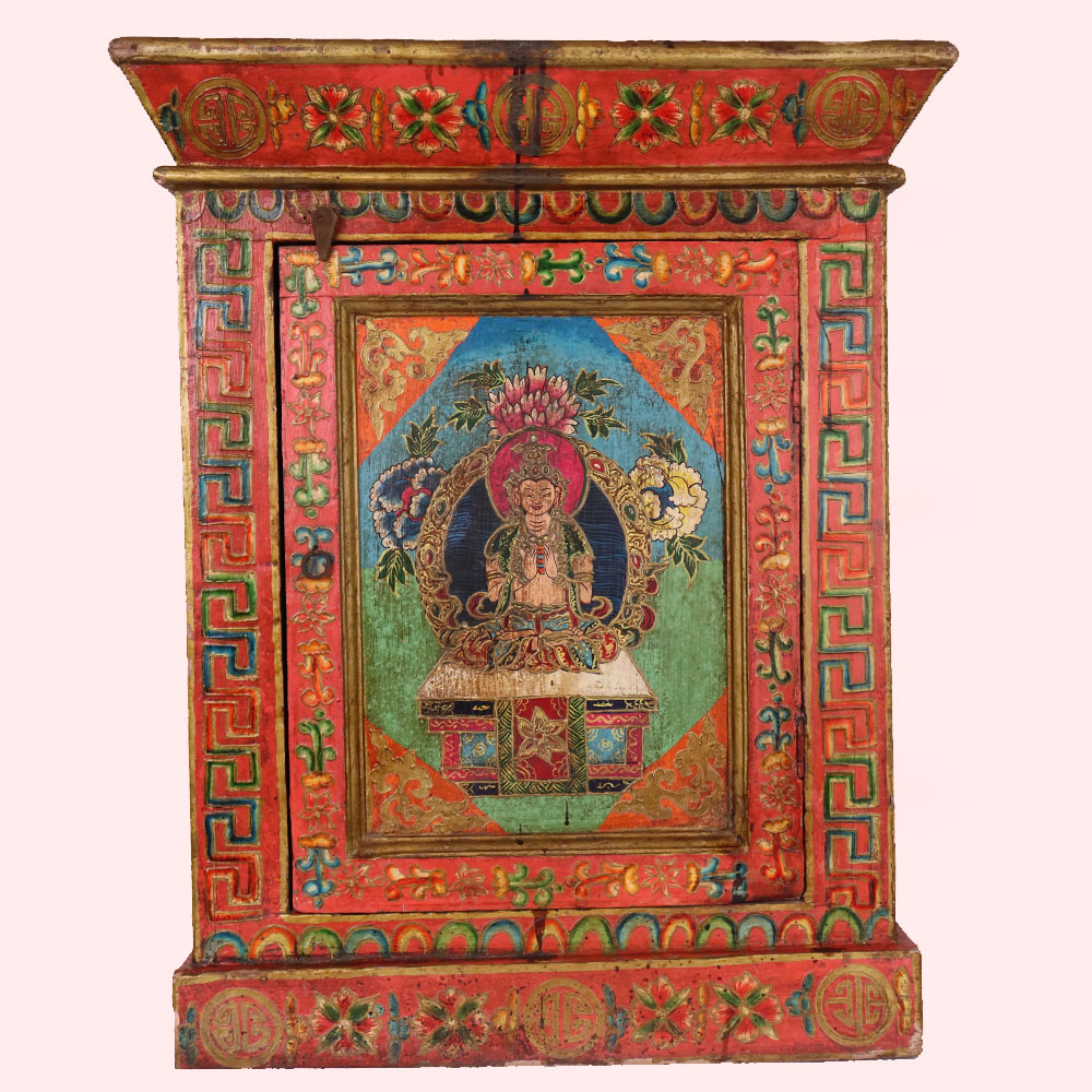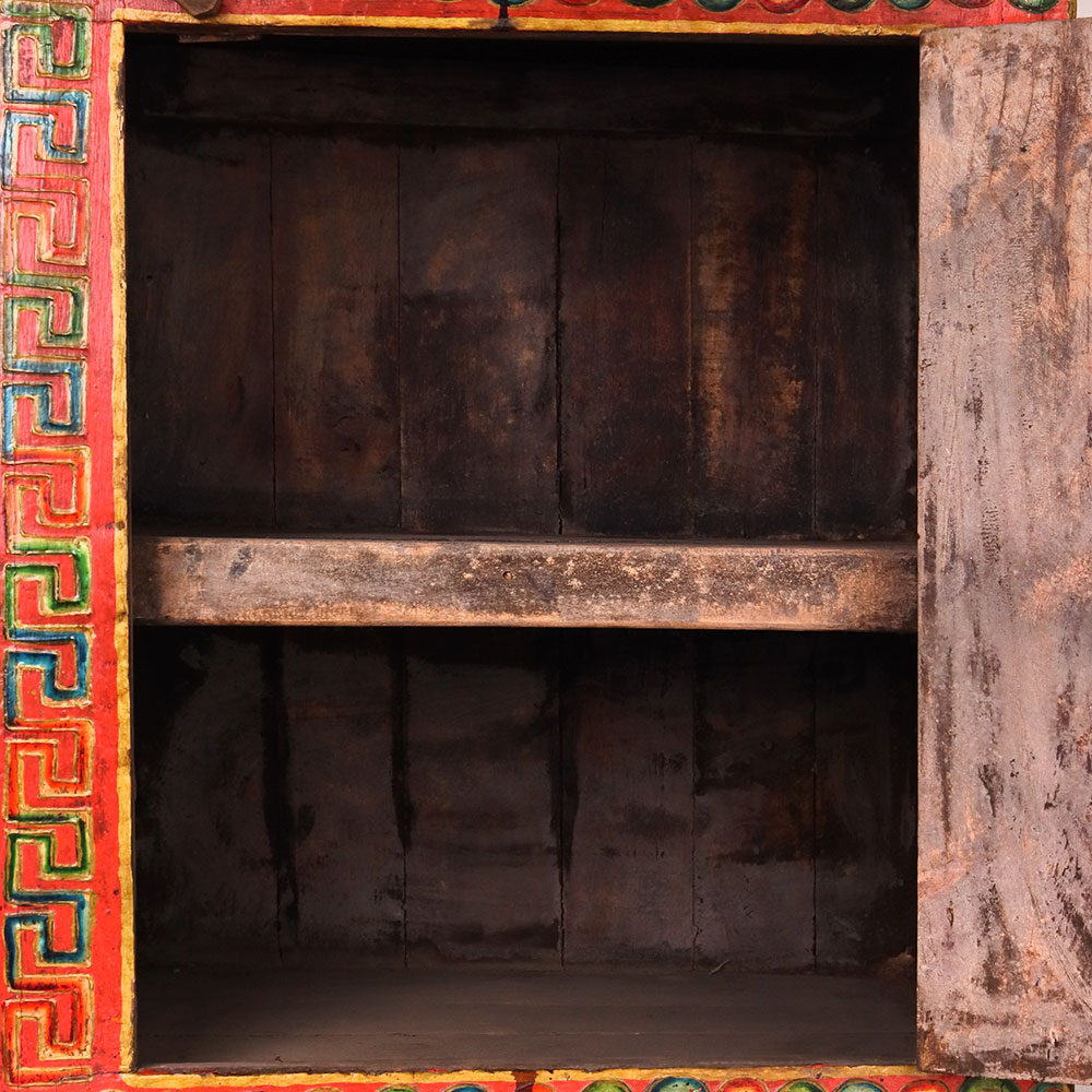 Add a touch of heritage to your décor with this handmade antique wooden box, beautifully hand-painted with a deity figure surrounded by lotus flowers and floral motifs. Crafted with precision by skilled artisans, this vintage cabinet features a striking red base highlighted with geometric and floral borders, symbolizing prosperity and protection. The interior includes a sturdy shelf, making it both decorative and functional for storing jewelry, keepsakes, spiritual objects, or personal treasures. Its distressed finish enhances the authentic antique look, while the intricate patterns and sacred designs reflect traditional Himalayan artistry. Perfect for altars, meditation spaces, or as a statement piece in eclectic interiors, this wooden box offers timeless beauty and practical storage. Each piece is uniquely handcrafted, ensuring one-of-a-kind charm for your home or collection.