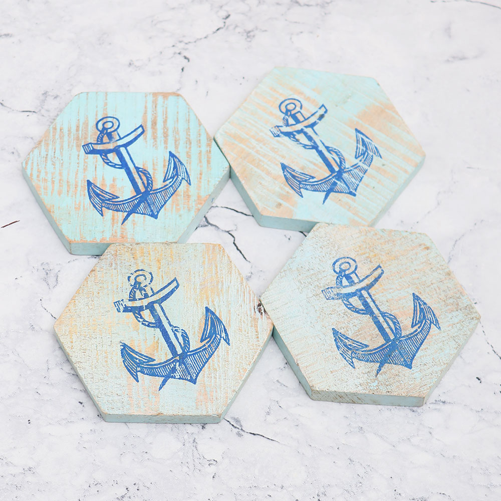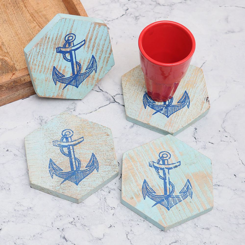 The best wooden coaster set you\'ll ever come across – buy our Handmade Wooden Coaster Pack of 4! Crafted with precision and love by skilled Indian artisans, each coaster is made from premium-quality wood, ensuring durability and longevity. Featuring a unique hexagon shape, these coasters will instantly elevate the aesthetics of any space. The light sky blue background adds a touch of serenity, while the engraved anchor in blue gives it a distinct charm. These coasters are not just practical but also serve as decorative pieces for your home, office or hotel. Designed to hold water, tea, juice, or coffee glasses, these coasters are perfect for use in your humble abode, office, restaurant, hotel, or cafe. They protect your surfaces from unsightly stains, ensuring cleanliness and elegance in every setting. These coaster sets make thoughtful gifts for your loved fours on special or festive occasions, adding a touch of sophistication to their spaces.