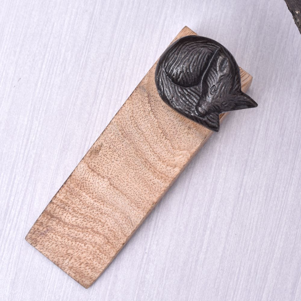 Our wooden door stopper is a timeless blend of craftsmanship and functionality. Meticulously handcrafted by highly skilled Indian craftsmen, this door stopper is a masterpiece crafted from high-quality wood, boasting an elegant brown finish that exudes elegance and charm. To complement its classic appeal, a striking black-finished fox made of iron is artfully attached to the wooden base, adding a touch of whimsy and character. Designed with practicality in mind, this door stopper features a rubber grip underneath, ensuring a secure grip on any surface and preventing slipping. Versatile in its application, it seamlessly fits into various settings, be it at home, office, restaurant, hotel, cafe, or shop, seamlessly merging aesthetics and utility. The perfect gift for near and dear ones on special occasions such as housewarmings or other celebrations.