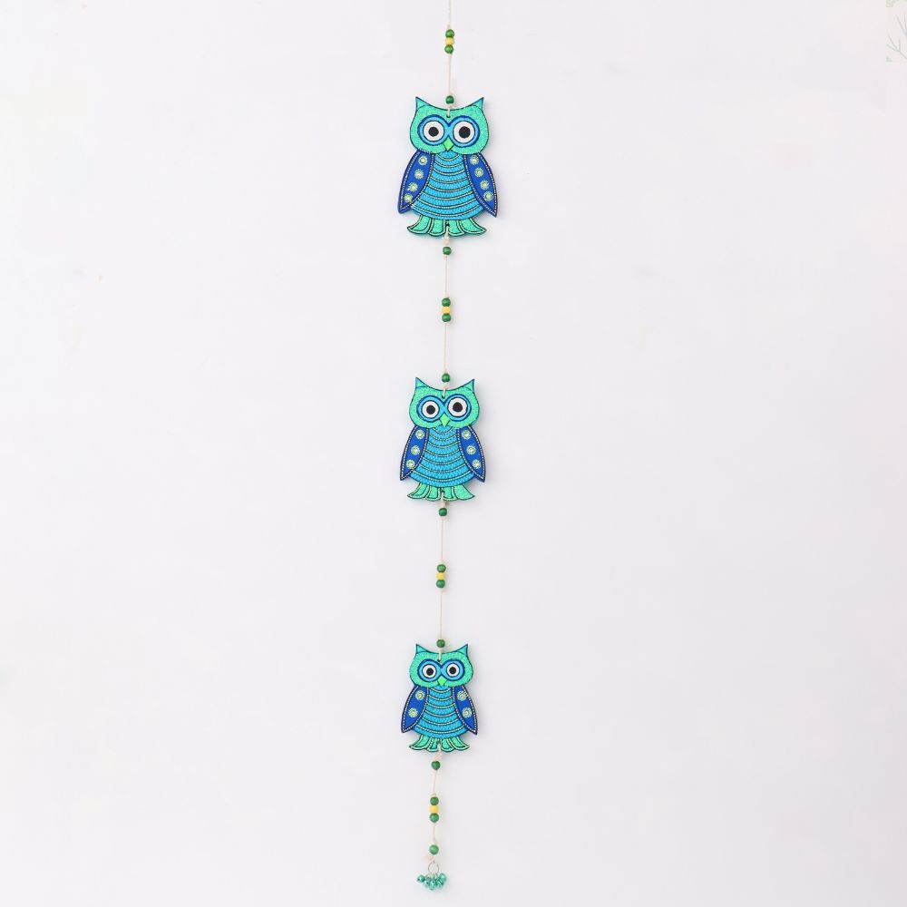 Add a touch of charm and wisdom to your interiors with this Handmade Wooden Owl Wall Hanging. Carefully hand-painted in soothing shades of green and blue, the three owls are beautifully strung together with decorative beads and a delicate bell at the end. Owls are often seen as symbols of wisdom, protection, and good luck, making this wall hanging a meaningful addition to your home or a thoughtful gift for loved ones. Perfect for hanging in living rooms, bedrooms, balconies, entrances, or study areas, this artistic piece blends cultural symbolism with vibrant craftsmanship.