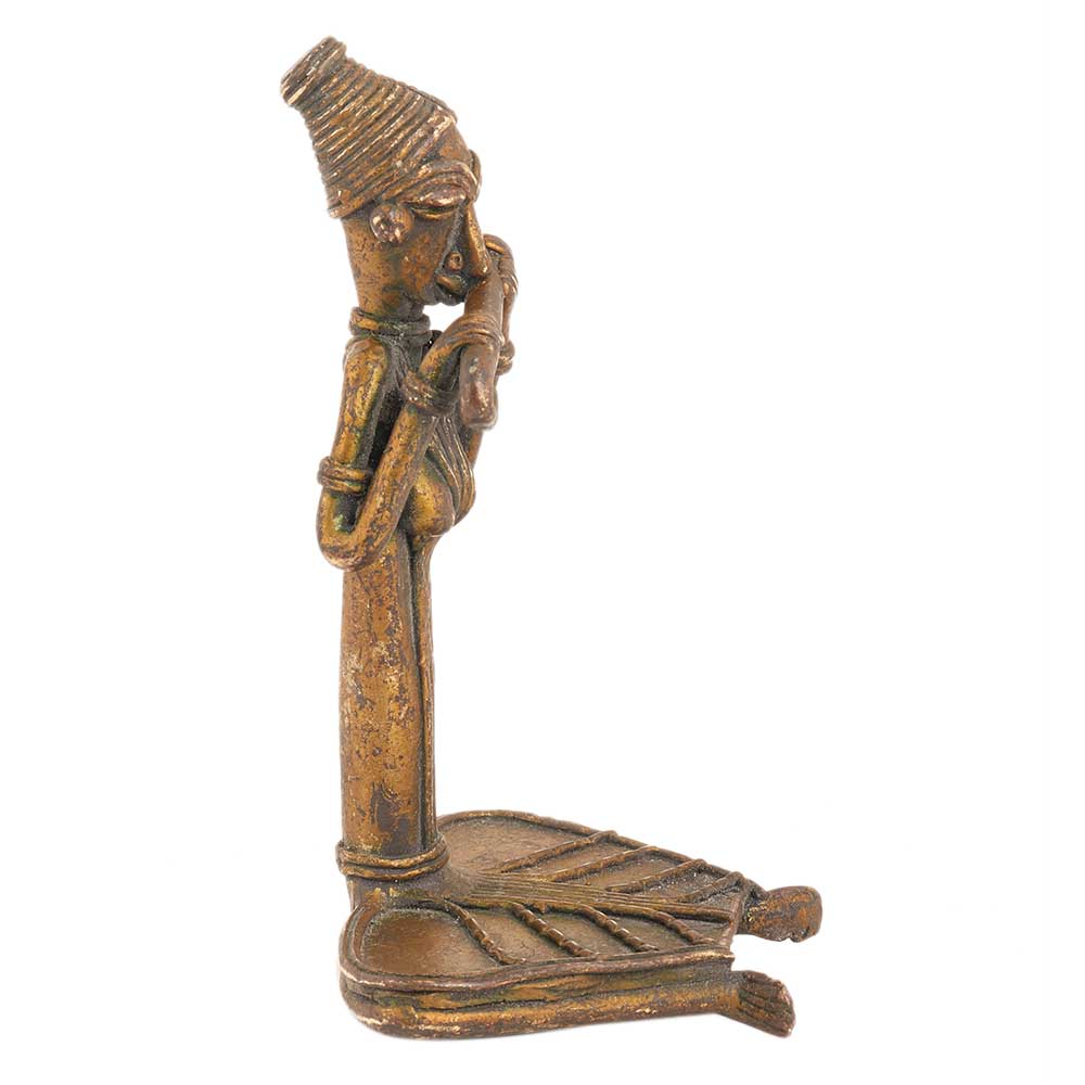 This is a brass dokra art statue of musician playing mahuri a kind of musical instrument of the tribal community. This figurine is created by skilled tribal craftsmen using traditional manual techniques. It can be used as an elegant exhibit on a living room table or glass shelf.