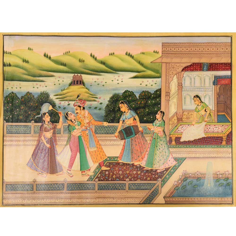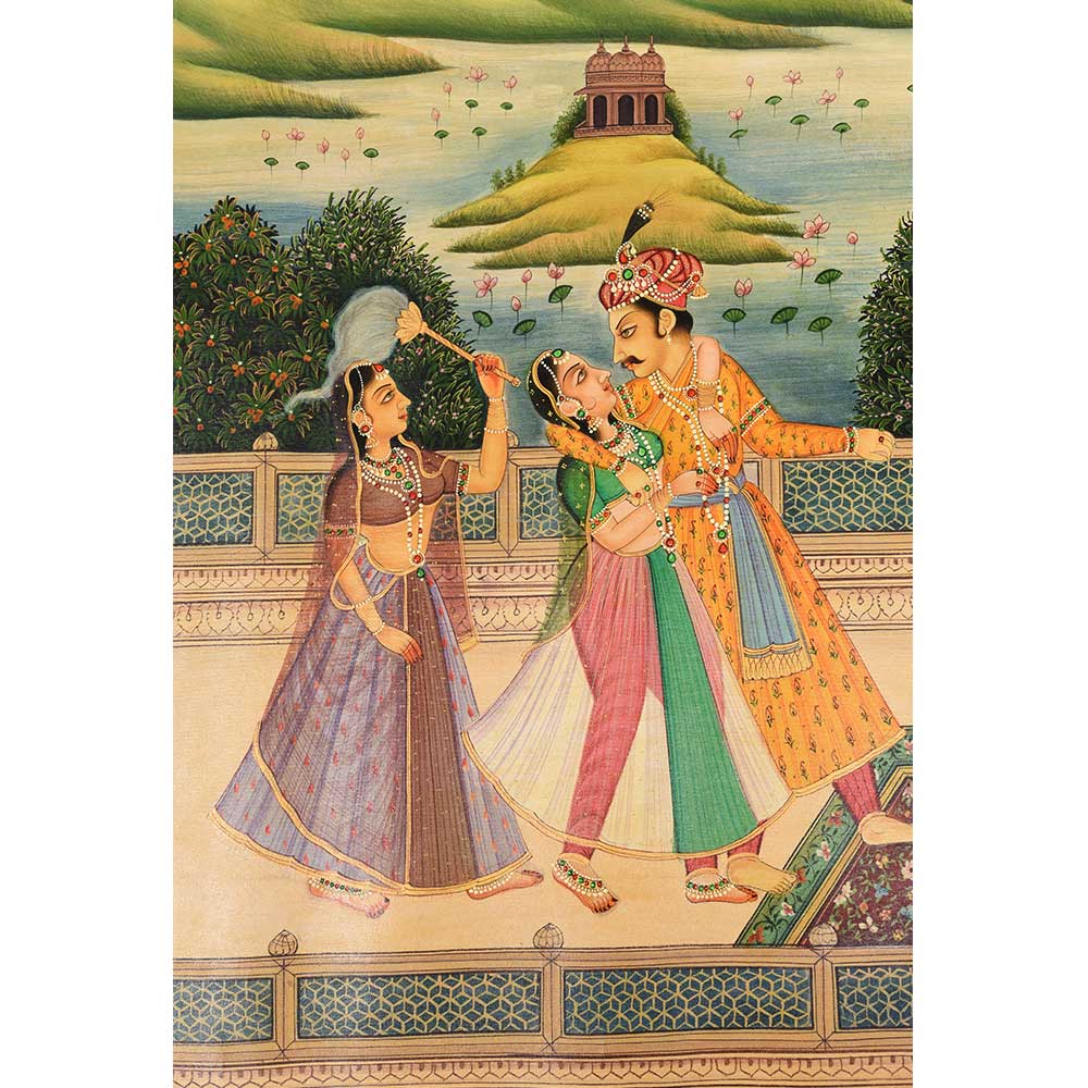 This is a rare Canvas painting from the Mughal era. It depicts the queen and the king enjoying wine in the open harem courtyard on the terrace. It is perfect for presentation, collection, and as a gift.