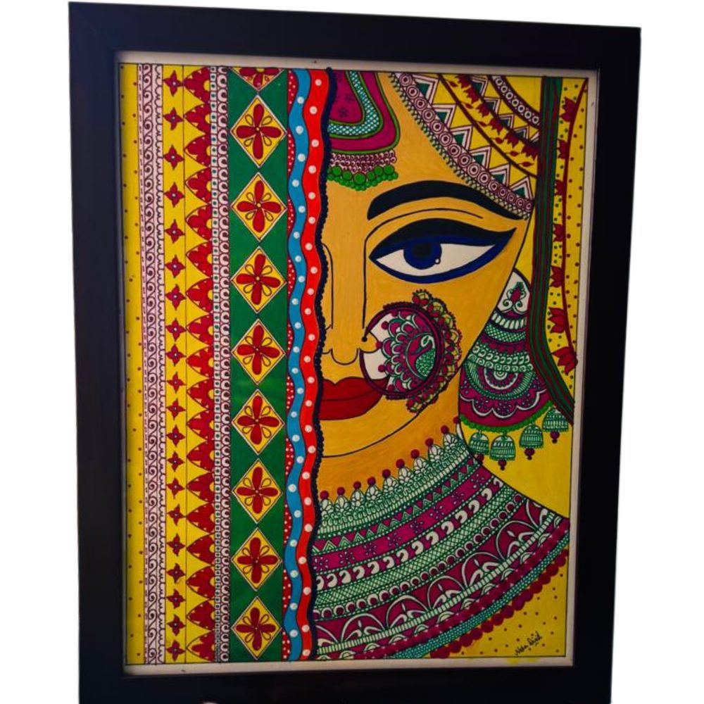 The girl in the Madhubani painting is adorned with vibrant colors, reflecting the rich cultural heritage of Mithila art. The colors used are bold, bright, and beautiful, adding to the overall charm of the painting.