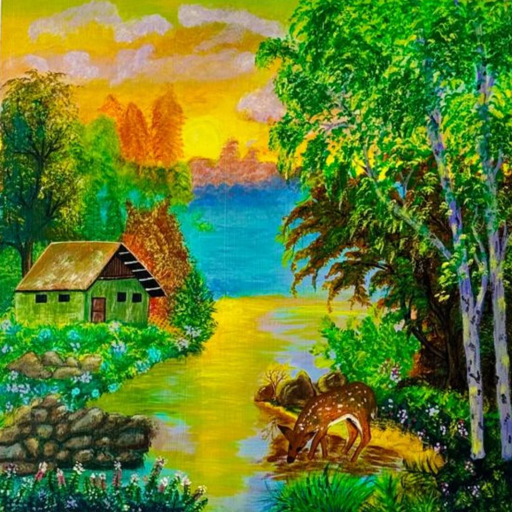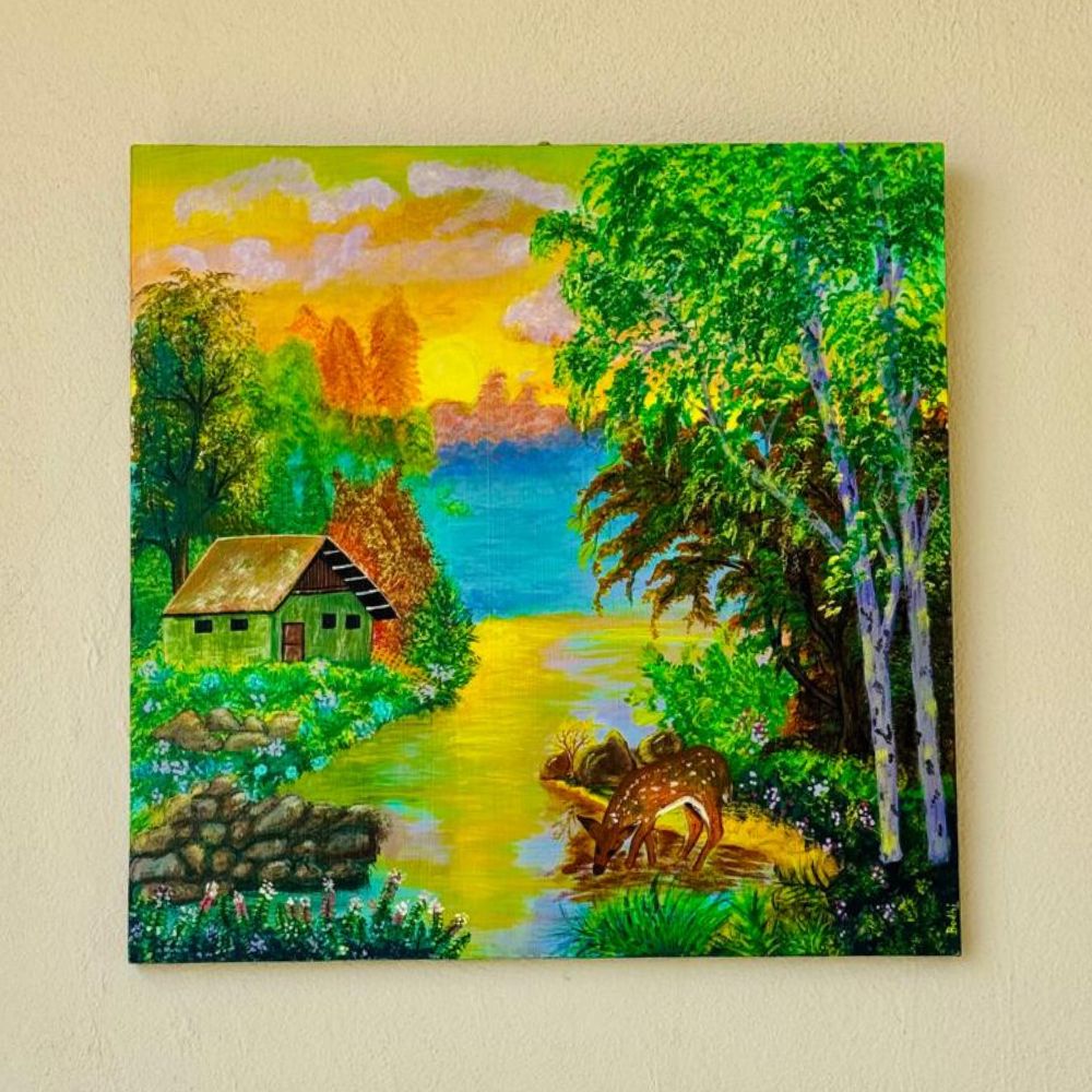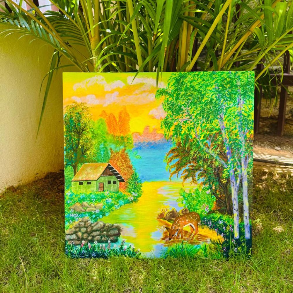 This village landscape painting exudes serenity and peacefulness, transporting you to a tranquil world. The soft colors and gentle brushstrokes create a calming atmosphere. The soothing color palette used in the painting creates a sense of calmness and relaxation. It's perfect for adding a touch of serenity to any room.