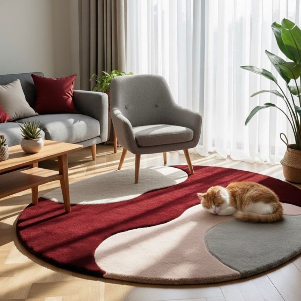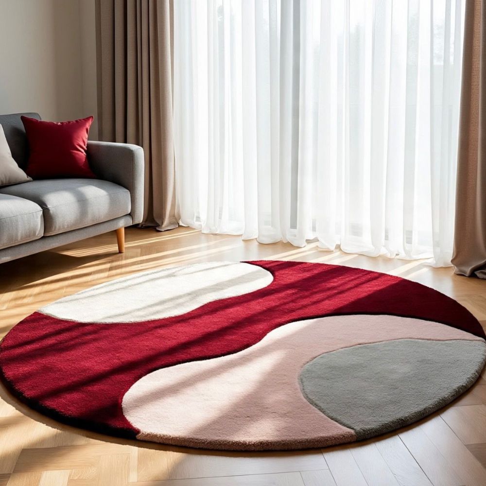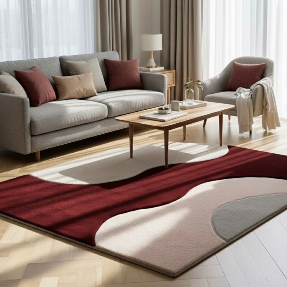 The Crimson Swirl Harmony Rug features a flowing abstract design, premium wool construction, and artisan-made quality that enhances contemporary interiors.