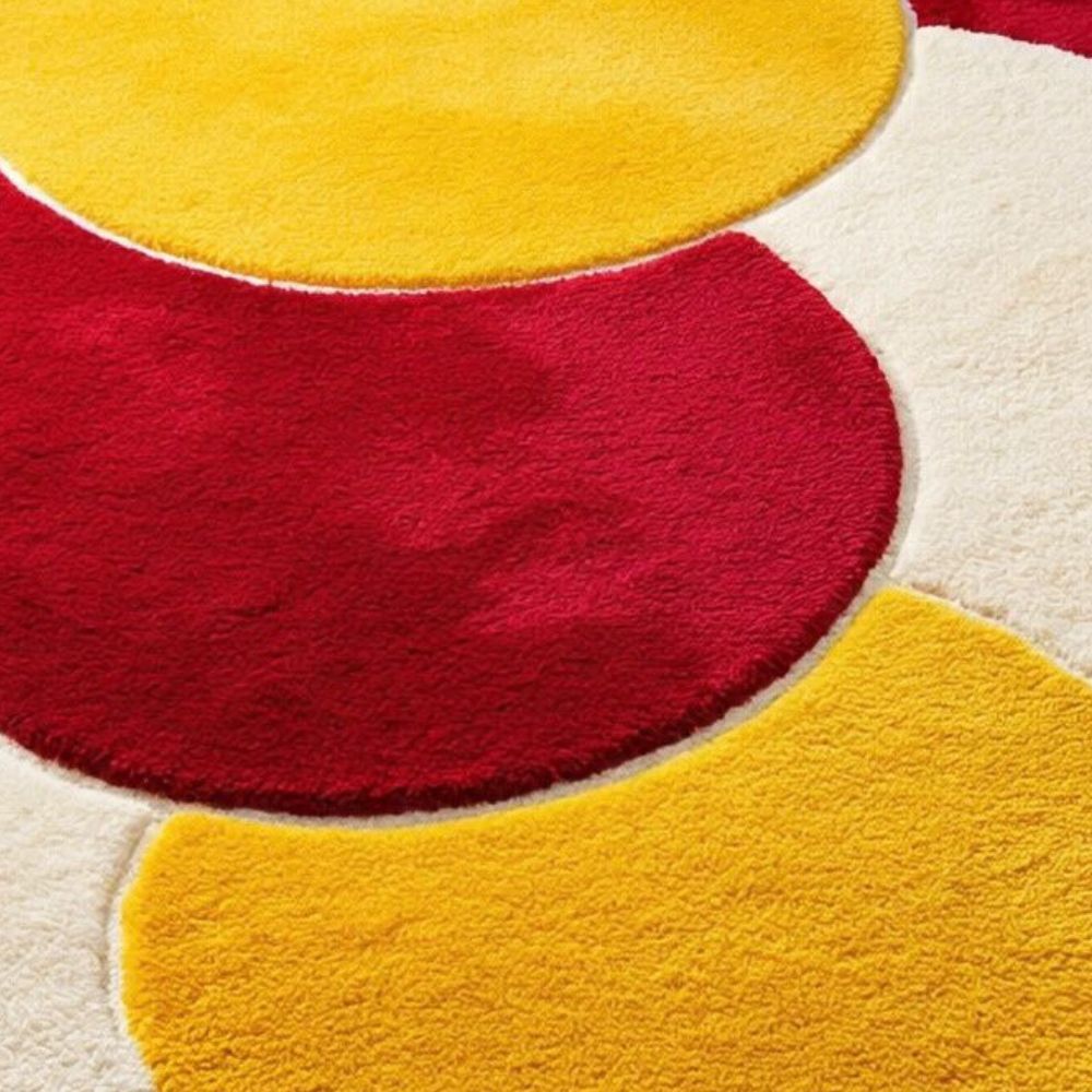 The Sunset Trio Circle design is geometric, crafted from pure wool for a statement rug that enriches any space.