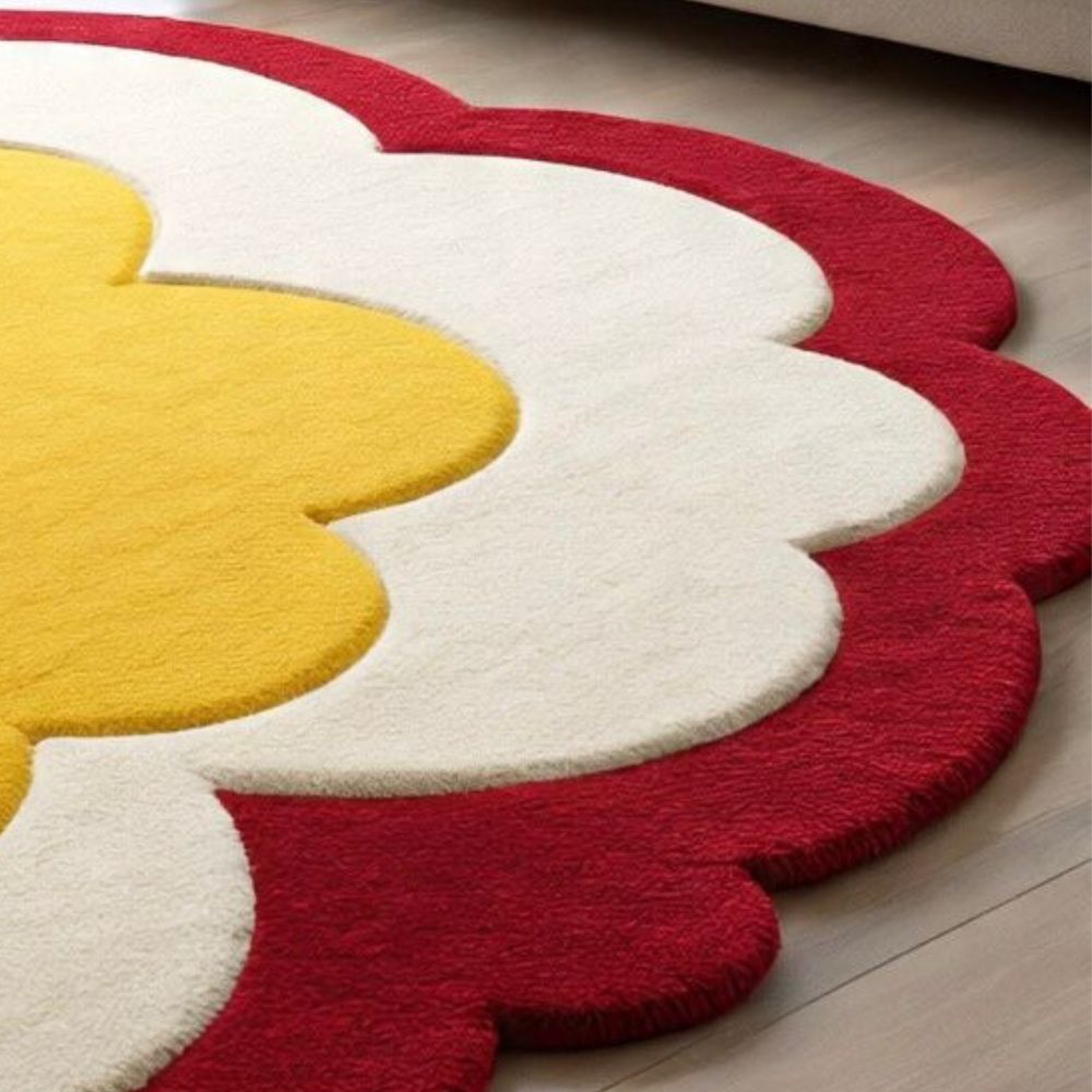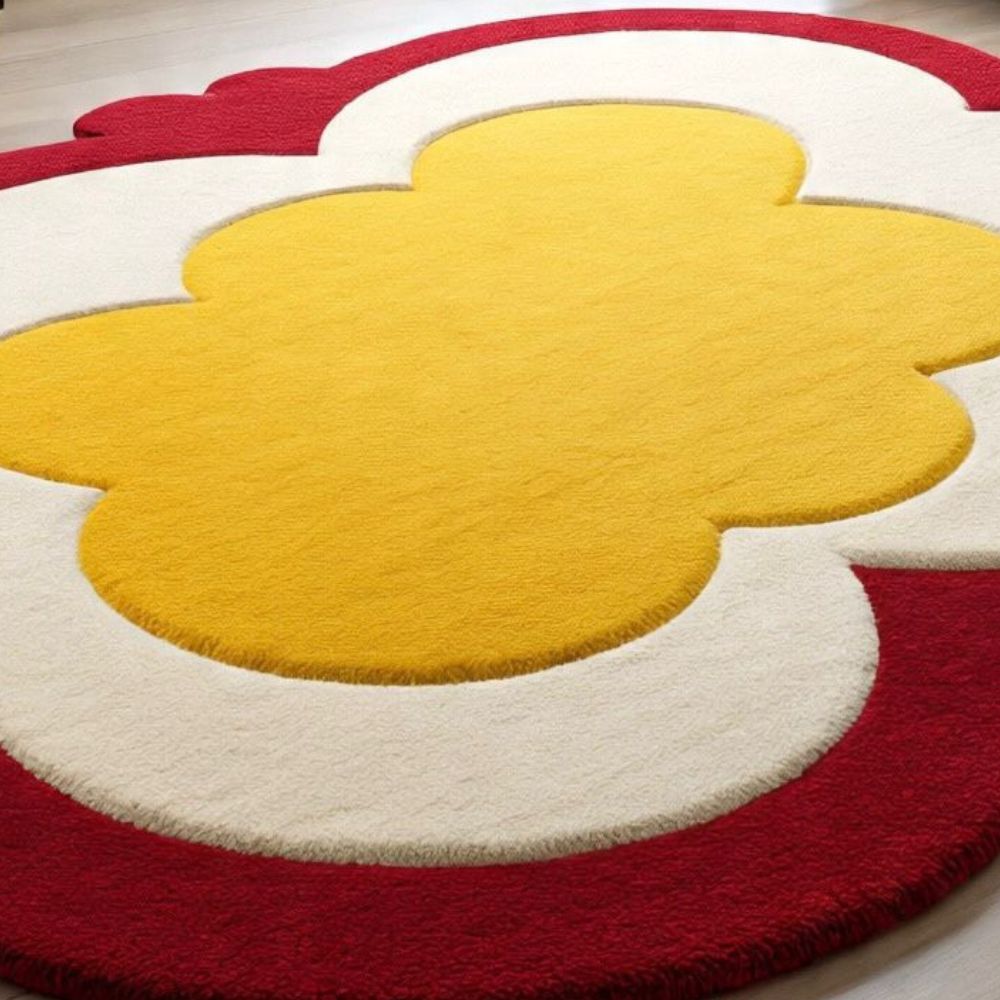 The Sunshine Blossom Round design is abstract, crafted from pure wool for a statement rug that enriches any space.