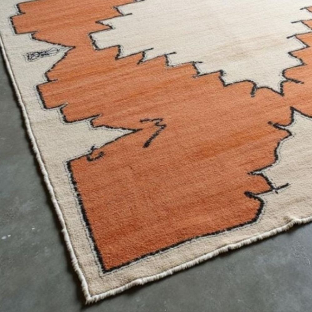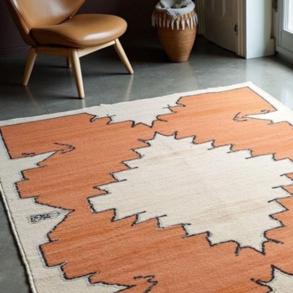 Bold Geometric Statement Features a striking orange and ivory palette with sharp, angular shapes outlined in black for a modern Southwestern flair. Premium Natural Wool Soft, warm, and naturally resilient wool fibers provide comfort underfoot and excellent wear resistance. Modern Meets Rustic Perfect balance between contemporary minimalism and rustic desert-inspired aesthetics. Versatile Placement Ideal for lofts, studios, living rooms, or as a striking centerpiece in modern interiors. Flatweave Comfort Lightweight, easy to handle, and low-pile for easy cleaning and layering. Custom Sizes Available Can be tailored to fit your exact space requirements. The striking orange and ivory color palette is accented with black outlines, creating a sharp, angular pattern reminiscent of Southwestern and desert-inspired designs. Woven by hand using premium natural wool, this rug offers a plush yet durable texture thats perfect for everyday living. Its low-pile flatweave construction ensures easy maintenance while providing a grounded, sophisticated look. This rugs bold geometric pattern makes it ideal for modern lofts, minimalistic homes, and eclectic spaces seeking a vibrant centerpiece. Whether placed in a living room, creative studio, or open-plan apartment, it will infuse warmth, personality, and visual impact into your space. As it Appears Pack of One Piece.