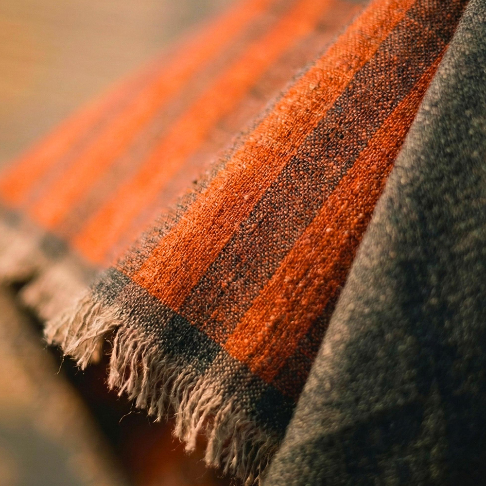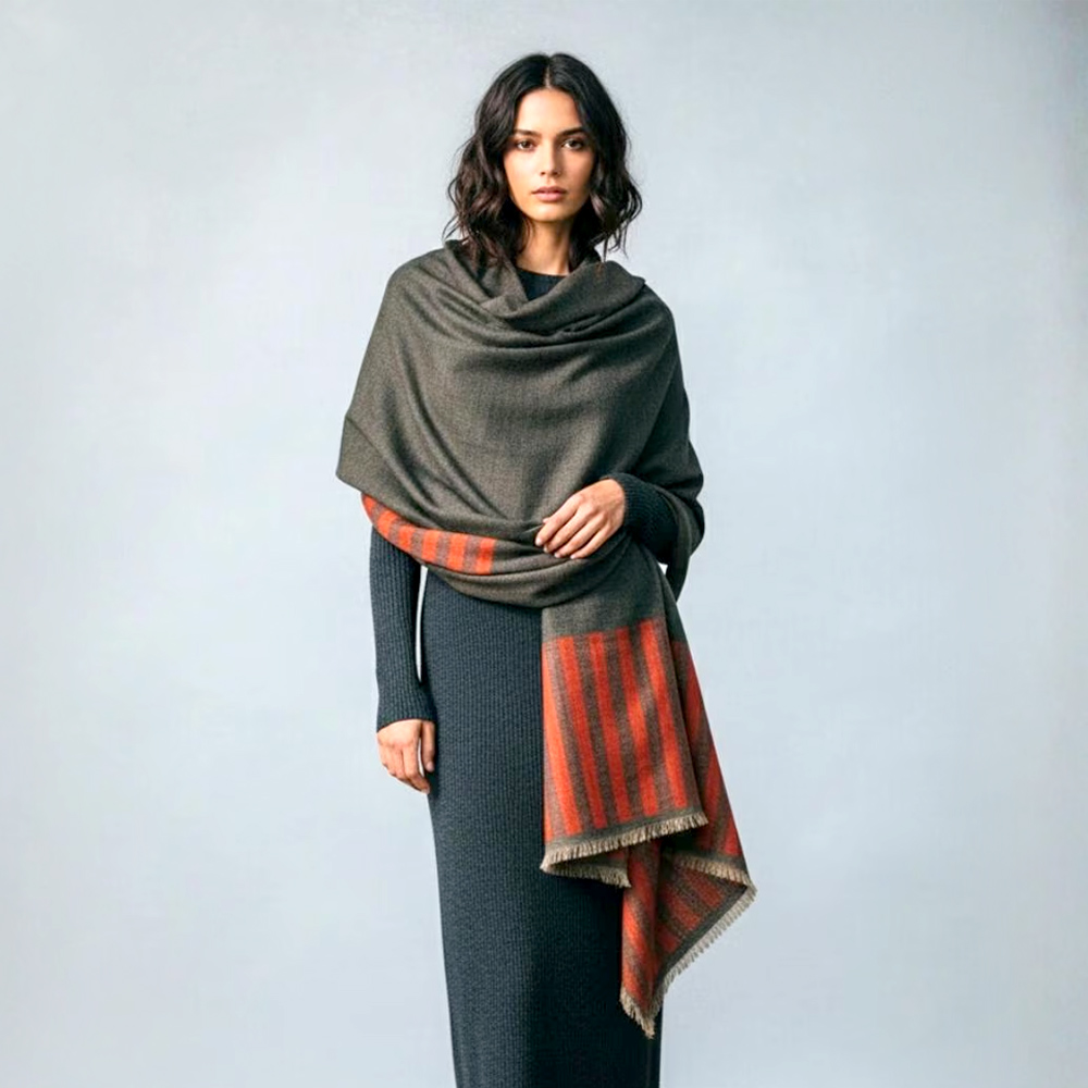 Elevate cold-weather layering with this handwoven wool and cashmere shawl, designed with a deep charcoal-grey body and a warm rust striped border. The refined weave creates a smooth, soft finish with natural insulation, while the contrast border adds a subtle statement without overpowering the look. Lightweight yet cosy, this shawl drapes fluidly over knitwear, coats, and winter dresses for a polished, everyday luxury feel.