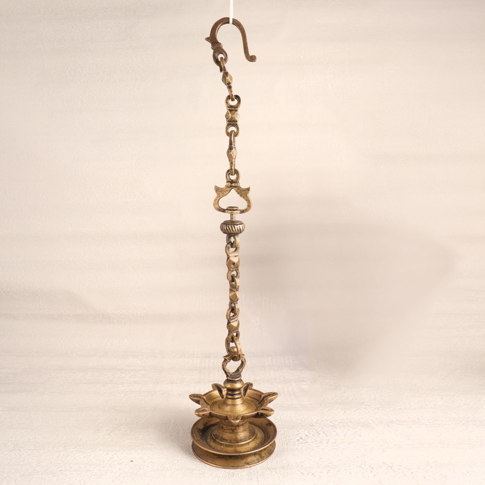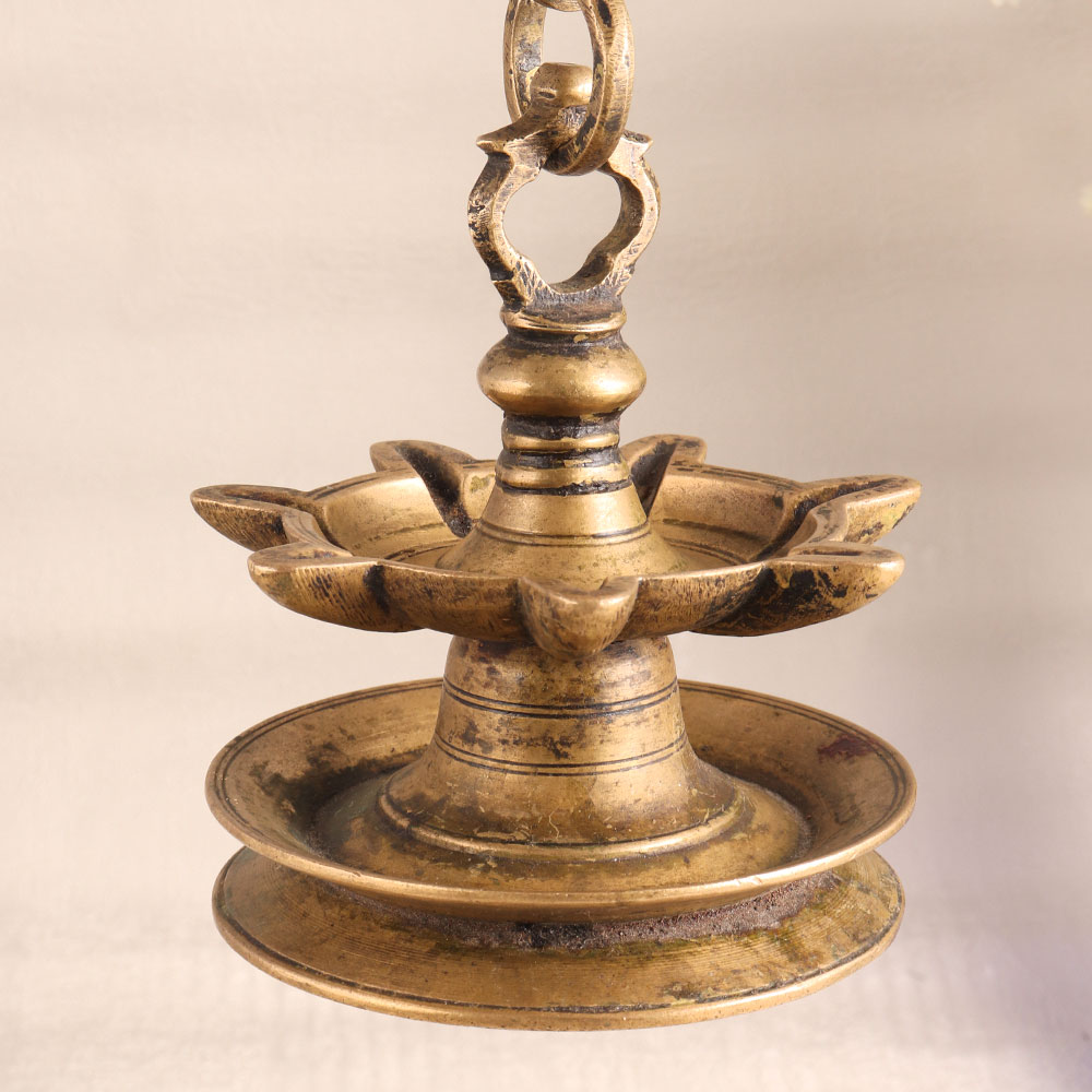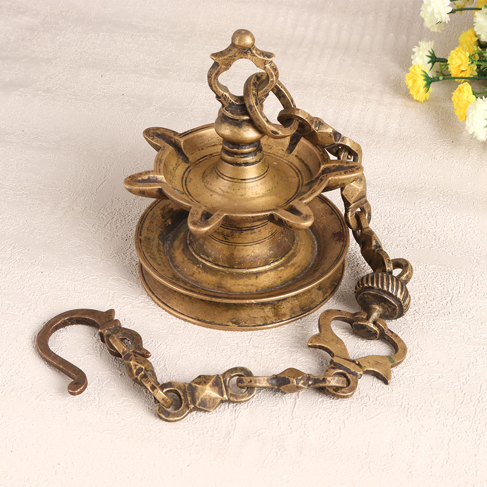 Enhance the ambiance of your living space with our Vintage Hanging Brass Oil Lamp. This timeless piece is crafted by highly talented Indian artisans that showcases the rich cultural heritage of India. Made from high-quality brass, it boasts an antique brown finish that exudes a warm, rustic charm. The lamp features seven jyots, each ready to be illuminated with either mustard oil or ghee, alongside cotton wicks. With a durable chain for effortless suspension, this lamp is a versatile addition to any setting. Whether you choose to hang it in your home, office, hotel, cafe, shop, restaurant, or prayer room, it serves both a functional and decorative purpose. Ideal for collectors, it adds a touch of vintage sophistication to your collection or exhibition. Moreover, this lamp is perfect for use during prayer ceremonies or auspicious occasions, infusing them with a traditional aura. It's also a meaningful gift for your family, friends or relatives on special, festive, or auspicious events, symbolizing the warmth of your affection and best wishes.
