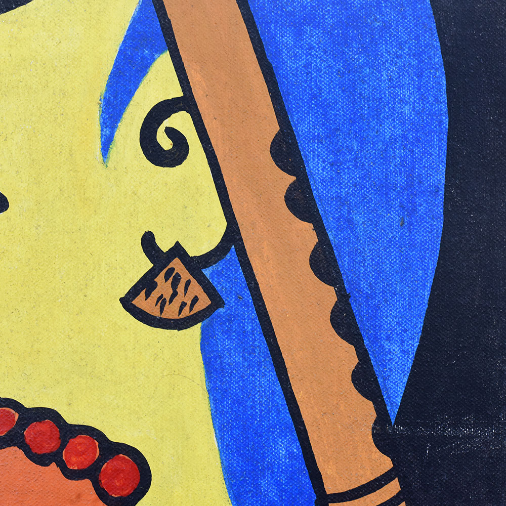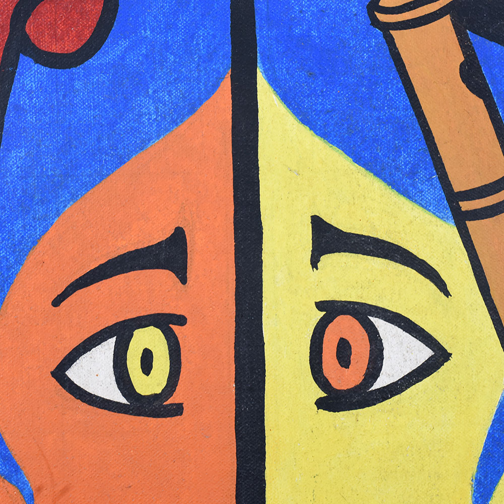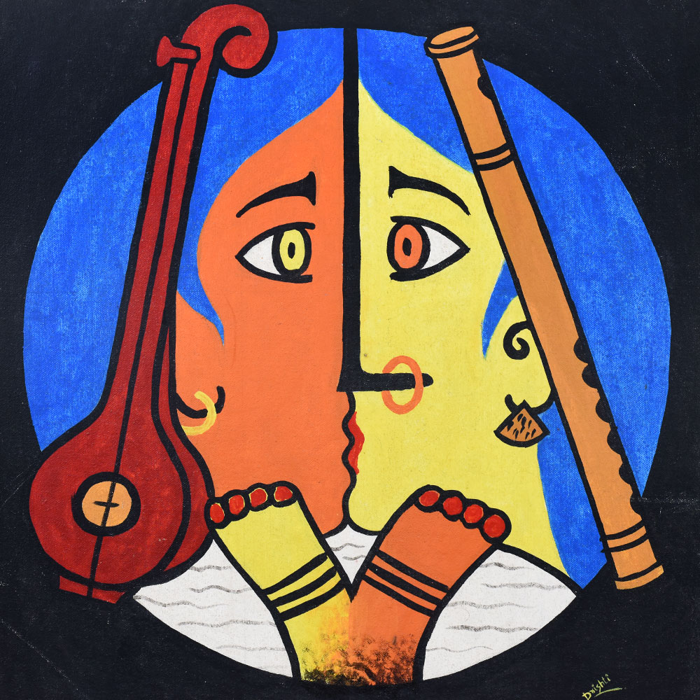 This striking canvas board painting presents a bold and modern depiction of divine duality through stylized abstraction. The artwork merges the faces of two iconic figures—Lord Krishna and Goddess Saraswati—into a single, symmetrical composition. One side features elements like the flute, symbolizing Krishna, while the other side carries the veena, representing Saraswati. Their shared face and joined feet, painted in contrasting warm and cool tones, reflect a fusion of masculine and feminine, music and wisdom, devotion and creativity. The circular background in vibrant blue enhances the spiritual harmony, while the black border grounds the composition with intensity and balance.
