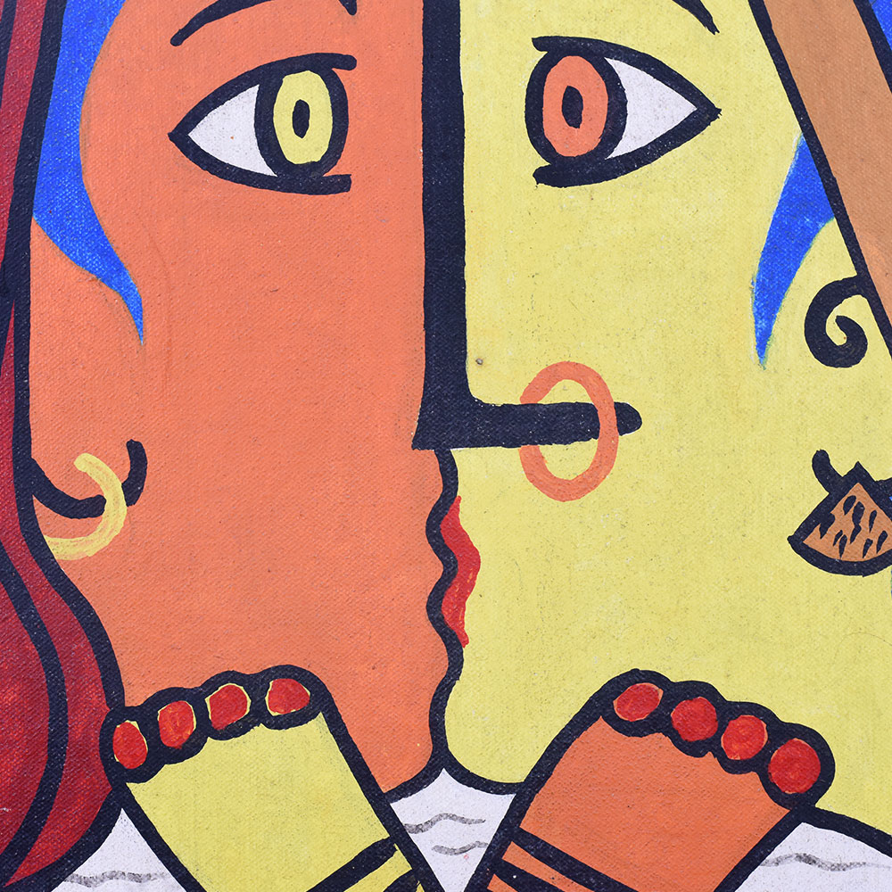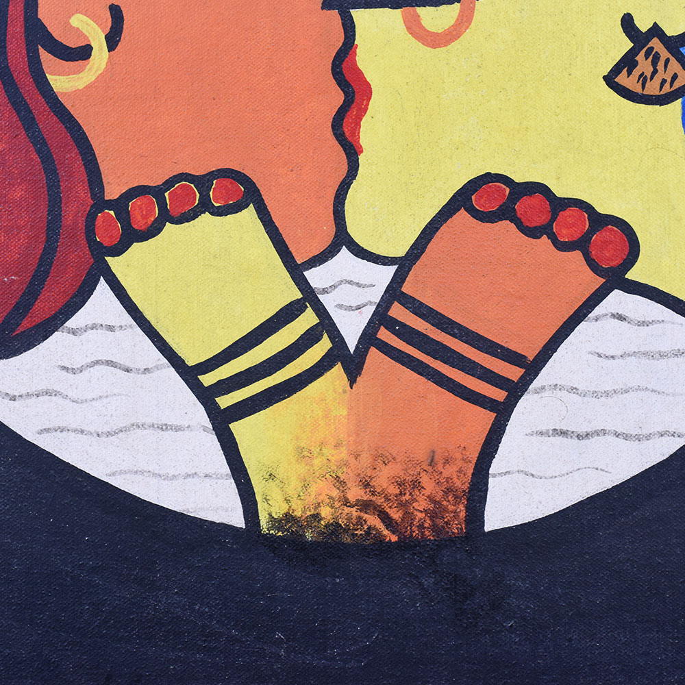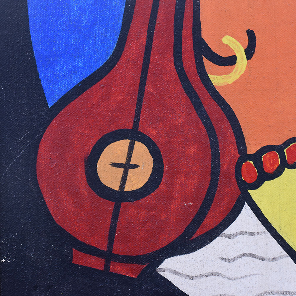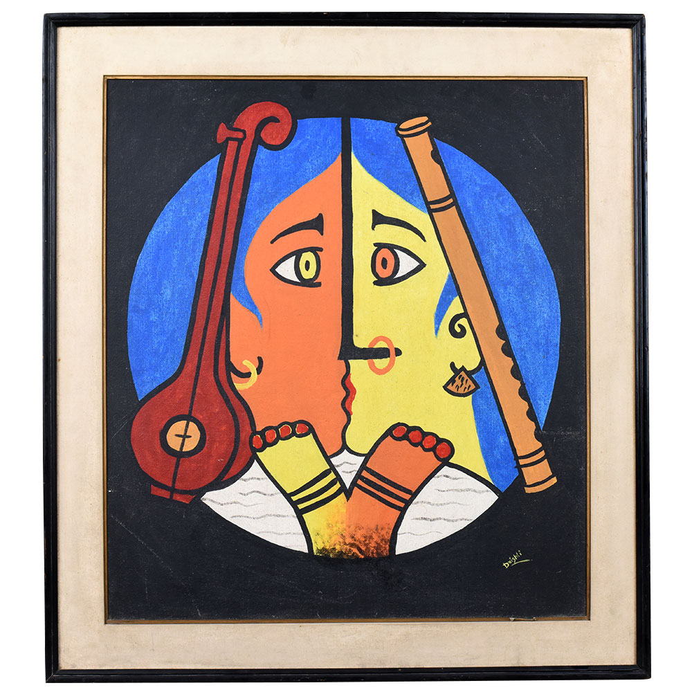 This striking canvas board painting presents a bold and modern depiction of divine duality through stylized abstraction. The artwork merges the faces of two iconic figures—Lord Krishna and Goddess Saraswati—into a single, symmetrical composition. One side features elements like the flute, symbolizing Krishna, while the other side carries the veena, representing Saraswati. Their shared face and joined feet, painted in contrasting warm and cool tones, reflect a fusion of masculine and feminine, music and wisdom, devotion and creativity. The circular background in vibrant blue enhances the spiritual harmony, while the black border grounds the composition with intensity and balance.