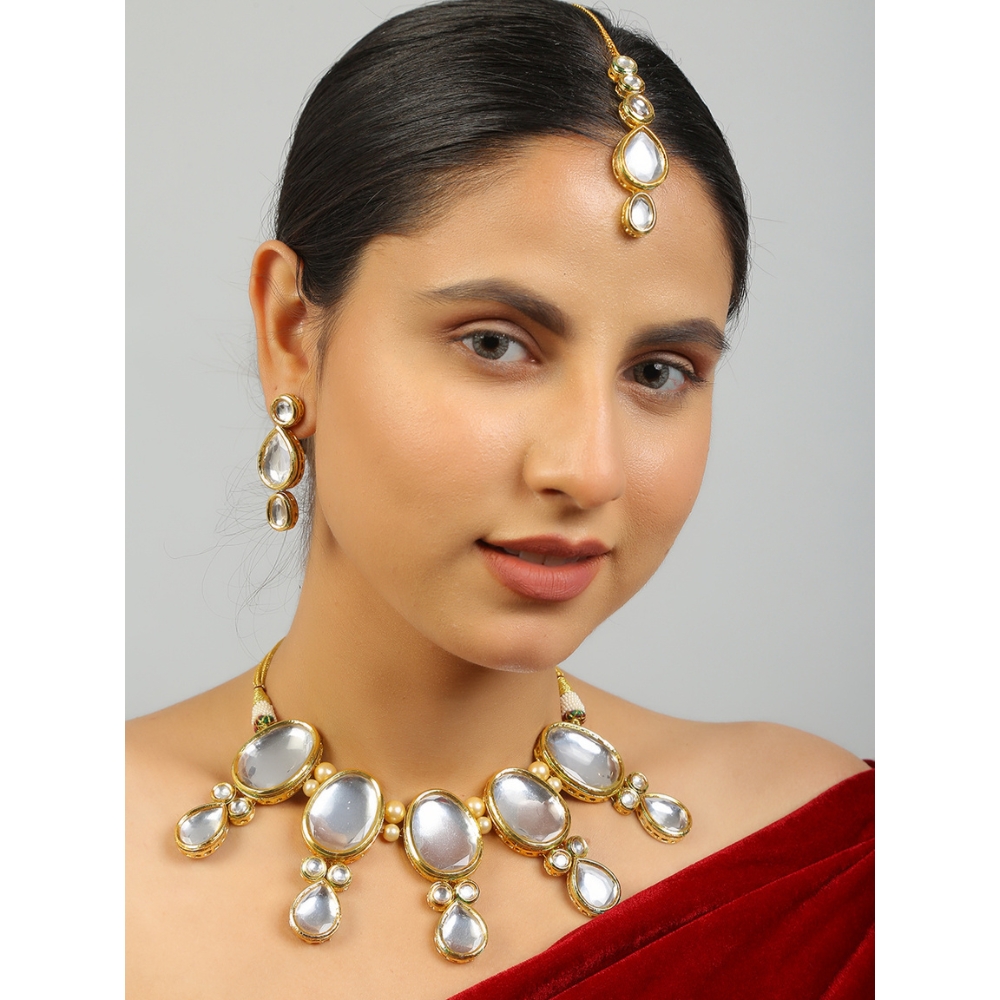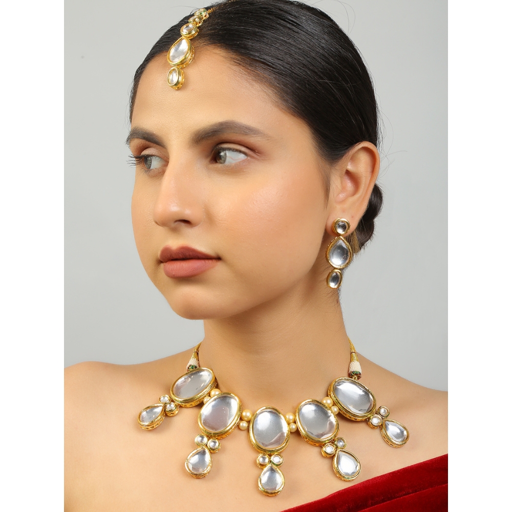The necklace is defined by hand-set oval kundan stones arranged to create a balanced and elegant neckline profile.