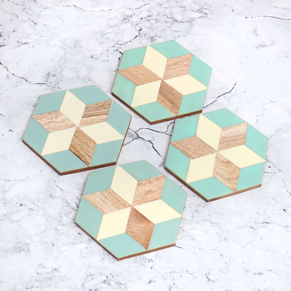 A beautiful Pack of 4 wooden tea coasters which is handmade by highly skilled and experienced Indian artisans. Made from high-quality wood, these coasters are the epitome of elegance and functionality. Their unique hexagon shape adds a touch of modern sophistication to any setting. The coasters feature a sky blue coloured background that complements any decor, and a brown and white coloured star delicately engraved on each four. With an antique finish, these coasters not only protect your surfaces from stains but also serve as stunning decorative pieces for your home or office. These versatile coasters are designed to hold water, tea, juice, or coffee glasses, making them perfect for use in homes, offices, restaurants, hotels, or cafes. They effortlessly blend style and practicality, ensuring your surfaces remain pristine. Ideal for gifting your loved fours on special or festive occasions, these wooden coaster sets make a thoughtful and timeless present.