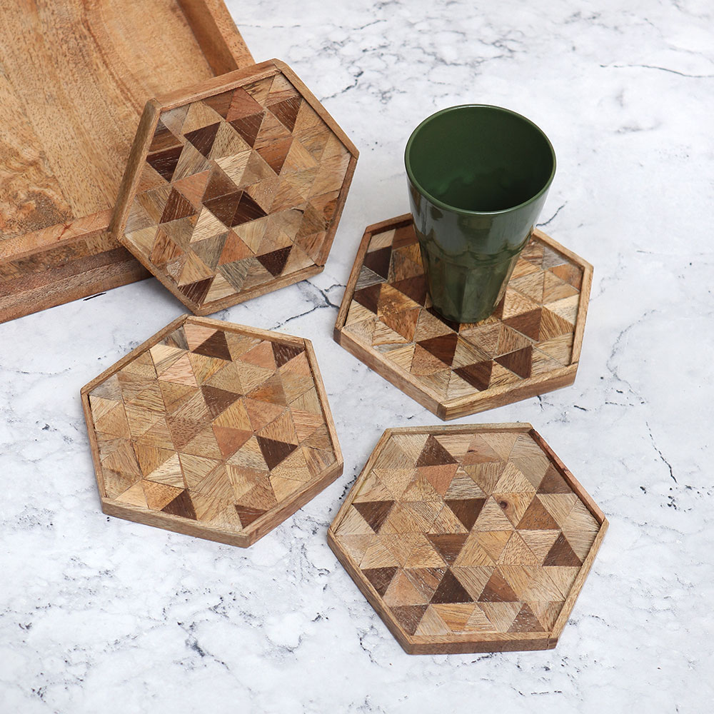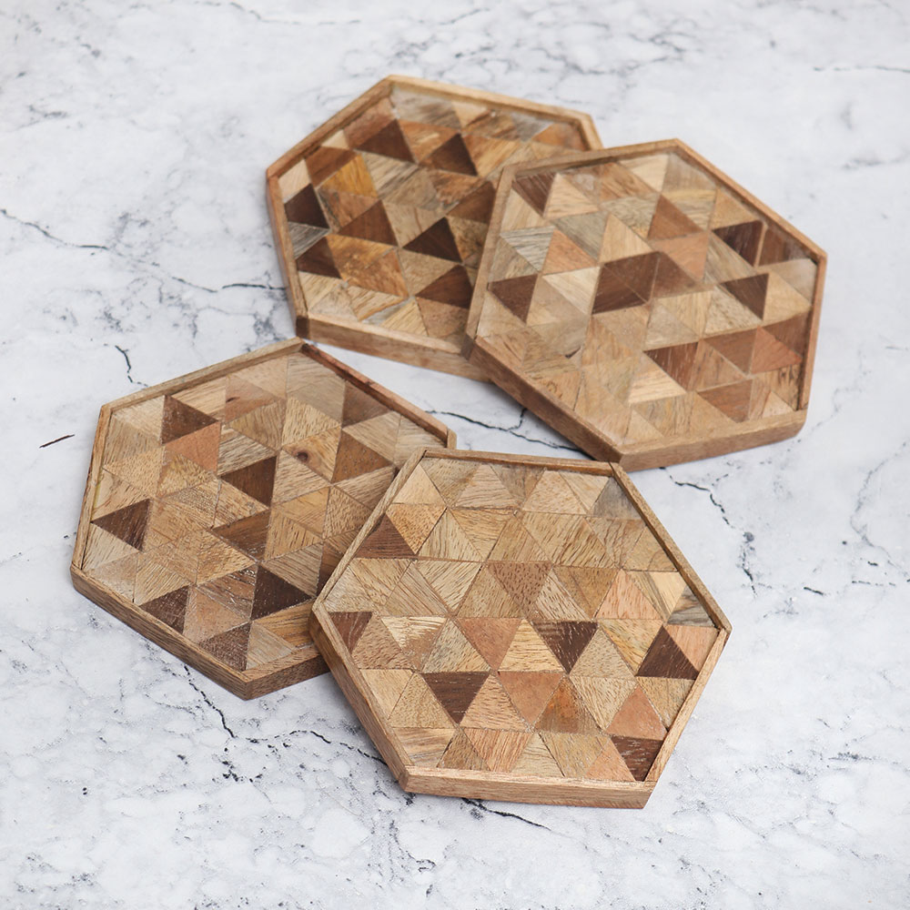 Buy a Pack of 4 wooden coasters online that is crafted with utmost precision and care by skilled Indian craftsmen. These coaster sets are the epitome of elegance and functionality, designed to enhance the aesthetics of your home or office. Made from the finest quality wood, each coaster features a unique hexagonal shape, adding a touch of modernity to the traditional design. The coasters are adorned with an intricate triangle pattern meticulously engraved by hand, creating a stunning visual appeal. With varying shades of brown and an antique finish, these coasters exude a timeless charm that seamlessly complements any decor style. They are perfect for holding water, tea, juice, or coffee glasses, preventing unsightly stains on your precious surfaces. Ideal for use at home, office, restaurant, hotel, or cafe, these coasters offer both style and protection. They make for a thoughtful gift for your loved fours on special or festive occasions, showcasing your impeccable taste and appreciation for traditional craftsmanship.