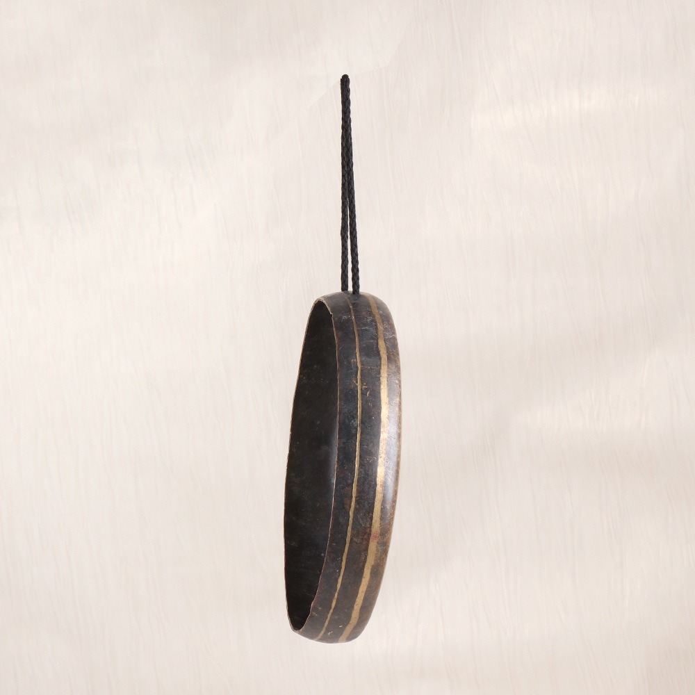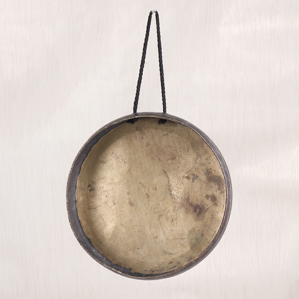 Elevate your spiritual journey and unlock the transformative power of Tibetan wisdom with this captivating vintage bell metal gong. Forged by master artisans in the heart of the Himalayas using centuries-old techniques, this stunning piece is a testament to the enduring legacy of Tibetan Buddhist practice. As the gong's rich, resonant tone reverberates through the air, you'll feel the weight of the outside world melt away, replaced by a profound sense of inner calm and clarity. The vibrations will guide you deeper into the present moment, allowing you to release stress, quiet your mind, and connect with your highest self. Whether you're seeking to deepen your meditation practice, create a soothing ambiance for yoga, or simply bask in the restorative energy of ancient Tibetan traditions, this gong will elevate your experience to new heights of enlightenment. Crafted with the utmost care and attention to detail, this vintage bell metal gong is a true work of art that will become a cherished centerpiece in your home or sacred space. Its durable bronze alloy construction ensures lasting beauty and performance, making it a timeless heirloom to be passed down for generations. Immerse yourself in the transformative power of Tibetan wisdom and let this magnificent gong be your guide on a journey of self-discovery and spiritual growth.