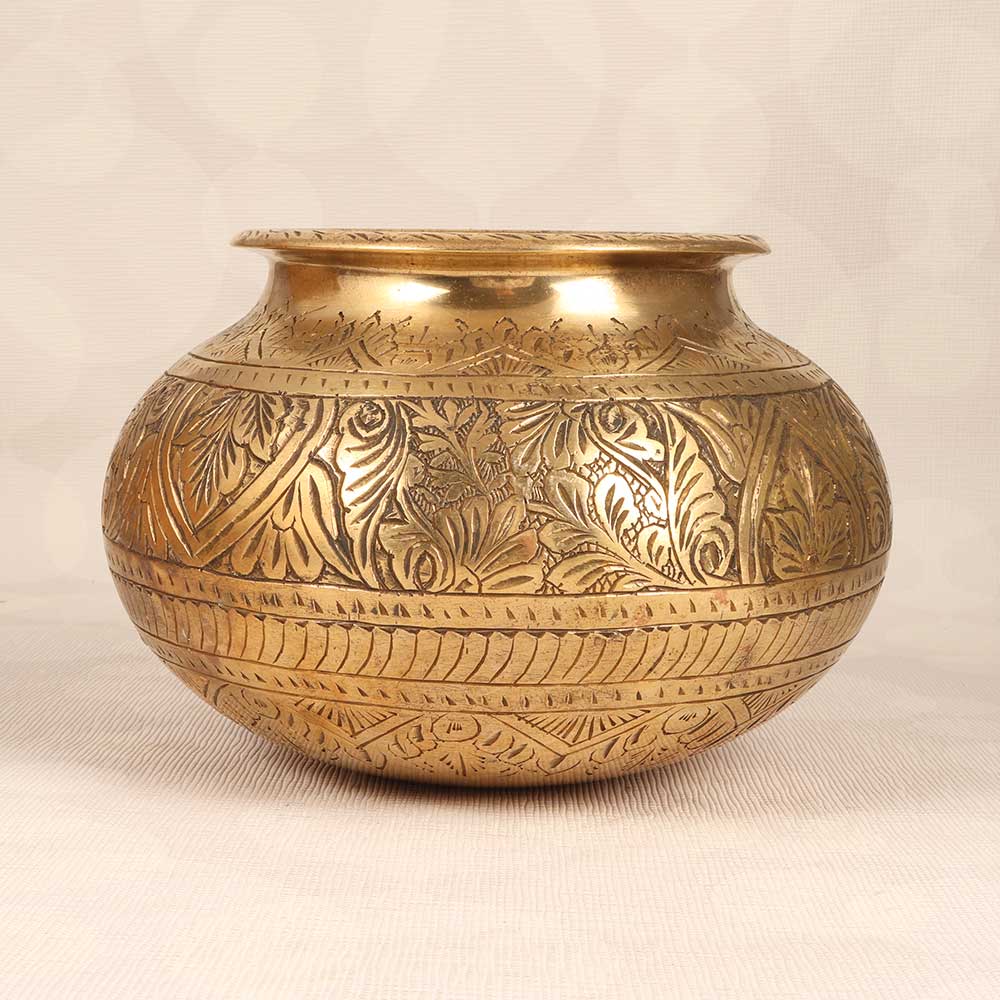 This antique brass cooking pot beautifully embodies the rich engraving tradition of South Indian artisans. Though too delicate for practical use today, its vintage patina and intricately etched design give it renewed life as a decorative accent piece. The smooth, curved shape and glinting golden brass create visual interest on console tables, bookshelves, or mantels. Place it as a unique vase, filled with fresh blooms, for an exotic statement. Or let it spark conversation as a stand-alone objet d'art, with its elegant form and detailed engraving taking center stage. However you display it, this brass pot adds a touch of exotic, vintage charm to any space. A treasure from generations past, ready to elevate your home decor today. With its rich history and artistic style, this engraved brass pot is sure to delight and inspire.