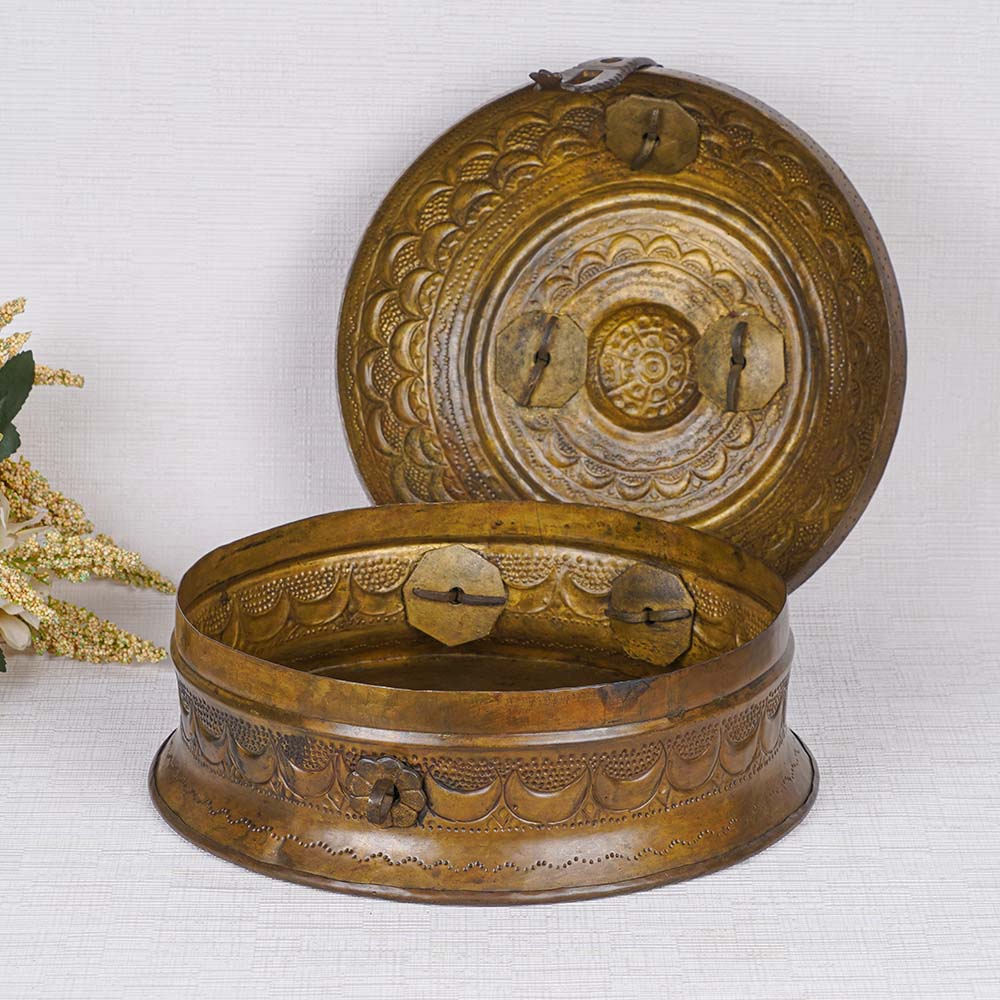 Buy a brass vintage jewelry box online from our website that is a true masterpiece of craftsmanship. This brown-coloured, round-shaped box is a nostalgic piece that will transport you to a bygone era. The box features a secure latch, ensuring your precious items are kept safe, while the elegant handle on top allows for easy portability. Adorned with intricate engravings, this jewelry box showcases beautiful designs that reflect the rich artistic heritage of India. This box is traditionally handmade by skilled Indian artisans, adding an authentic touch to its allure. Originally used to store jewelry in Indian households, this box now offers versatility for various purposes. Whether you seek a stylish girl’s jewelry box, a luxury jewelry box for your cherished collection, or a stunning jewelry gift box, this vintage brass creation is the perfect choice. It can store your jewelry or small keepsakes, serve as a captivating display piece at exhibitions, museums, shops, hotels, or restaurants. Furthermore, this jewelry box makes an incredible gift for your loved ones on special occasions or festive celebrations. Embrace the charm and elegance of this brass vintage jewelry box, a timeless treasure to be cherished for generations to come.