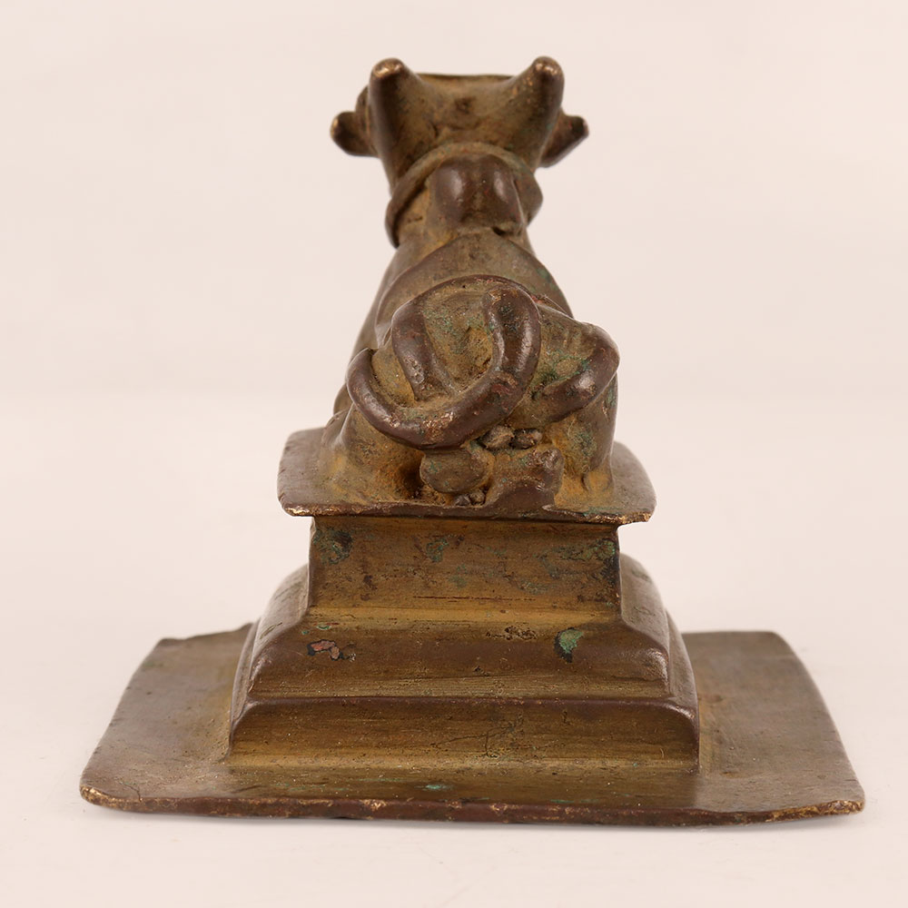 Buy a small sitting Nandi brass statue that is handcrafted by highly talented Indian artisans hailing from the picturesque landscapes of Himachal Pradesh. This magnificent piece captures the essence of devotion and artistry in a stunning antique brown finish, adding an aura of antiquity and grace to any setting. Lord Nandi, the sacred bull vahana of Lord Shiva, symbolizes strength, loyalty, and unwavering devotion. This finely detailed statue not only embodies the spiritual significance of Nandi but also showcases the artistry and mastery of traditional craftsmanship. Perfect for adorning homes, offices, restaurants, hotels, cafes, or shop prayer rooms, this statue serves as both a divine symbol for worship and an exquisite decoration. Its versatile design harmoniously blends with various aesthetics, making it an ideal addition to any space. Collectors of vintage art will find this piece a treasured gem, while its elegance makes it a thoughtful gift for your family, friends or relatives on special, festive, or auspicious occasions.