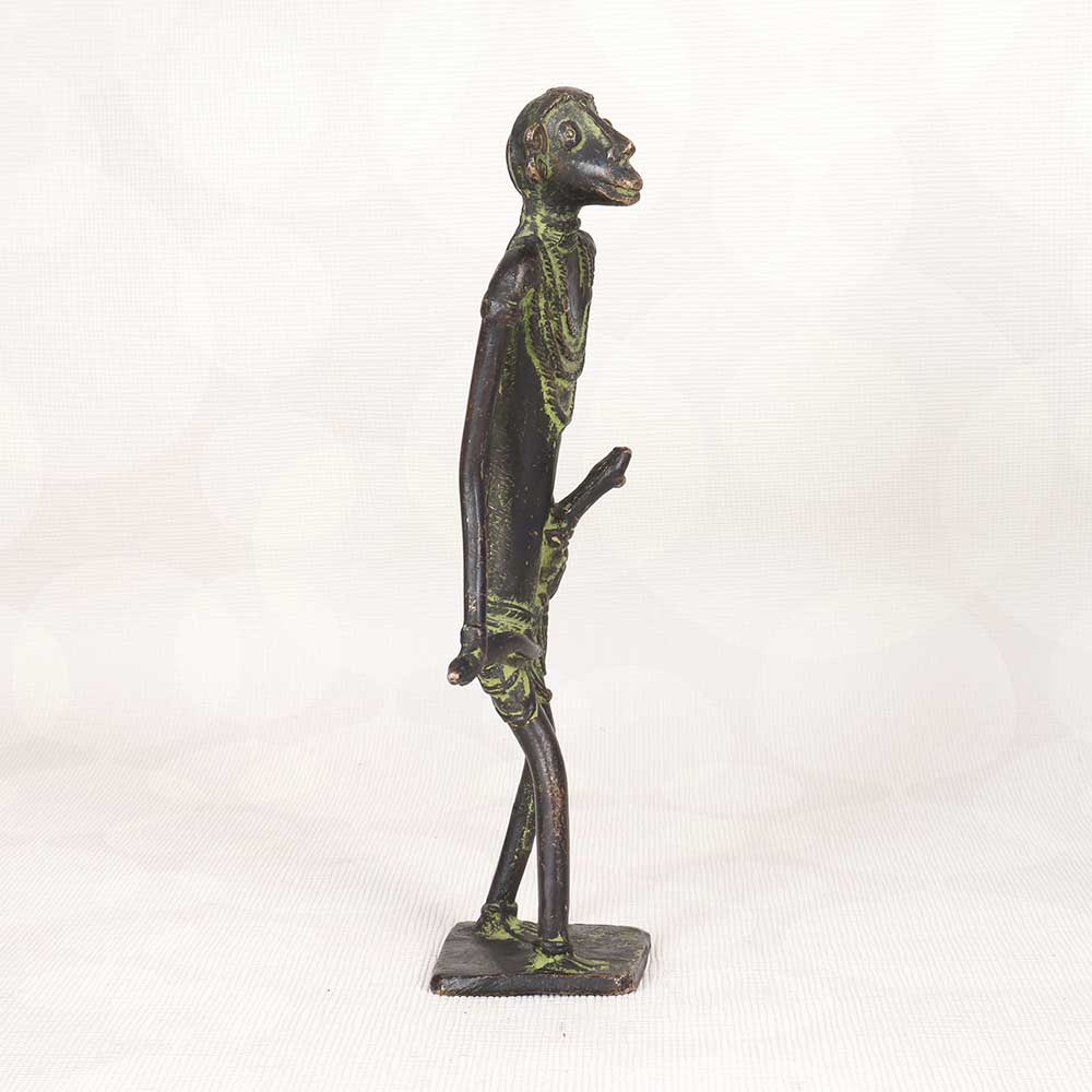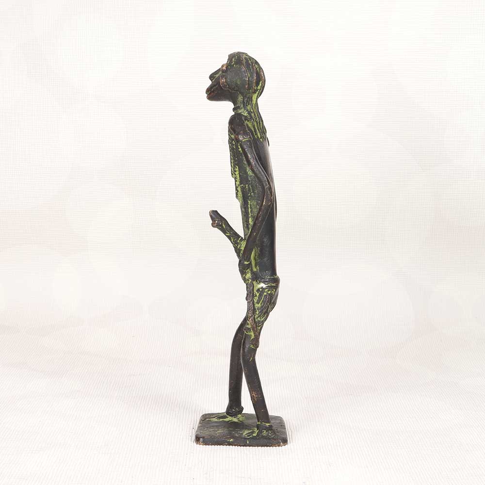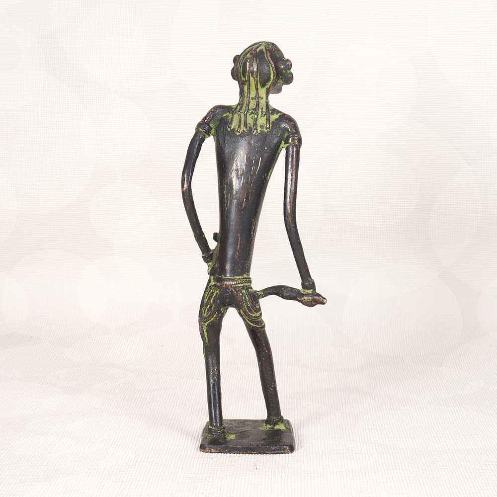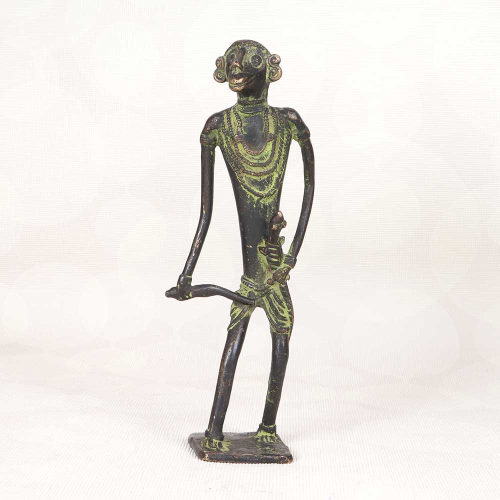 This mesmerizing vintage brass statue depicts a Bastar tribal hunter, hand-cast with vivid attention to detail. Showcasing the iconic art of India's Bastar region, this statue portrays a muscular tribal man standing tall with fish and knife in hand. Intricate patterns hand-etched on the man's garments and jewelry reflect Bastar's indigenous artisanry. The powerful stance and fierce expression convey the Bastar tribes' prowess as hunters attuned to the wilderness. This substantial, foot-tall statue packs visual impact, making a bold decorative statement. Bring a global element to your home with this Bastar tribal man statue. Its brass finish lends an antiqued, heirloom vibe. A must-have for art lovers and world travelers drawn to rare cultural artifacts. With its raw, primal style, this statue symbolizes early man's connection to nature and the hunt. A showstopping Bastar Art accent for living spaces.