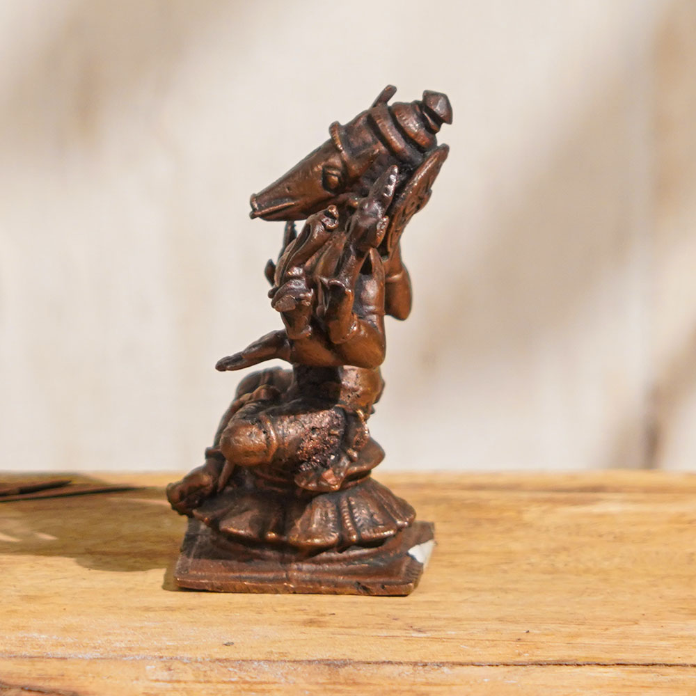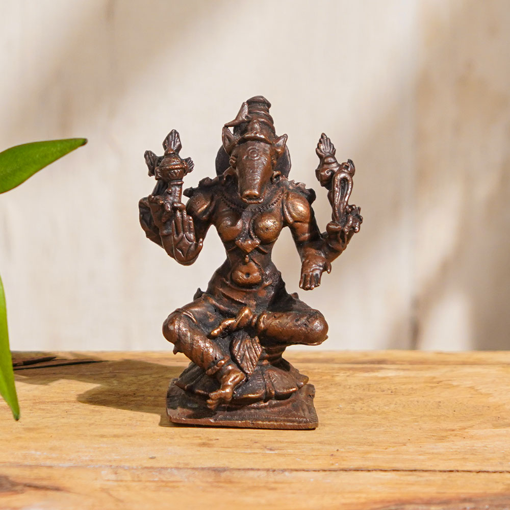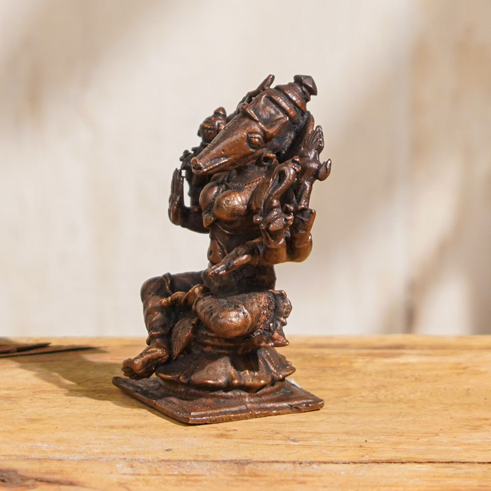 Introducing the exquisite Copper Goddess Varahi statue, a stunning depiction of the revered Hindu Goddess Sarahi. This intricately handcrafted masterpiece was created by professional Indian craftsmen and is a true symbol of the rich cultural heritage of India. The statue showcases Goddess Sarahi bearing the head of a sow, an image that holds deep significance in Hindu mythology. This impressive statue is not only a beautiful piece of art but is also believed to bring positive energy and prosperity to your home or place of worship. Buy this copper Goddess Varahi statue online and get a hassle-free delivery at your doorstep. It is an ideal gift for auspicious occasions such as weddings, housewarmings, and other special celebrations. It can also be used as an attractive decoration in homes, offices, restaurants, hotels, and shops. The statue, also known as a murti in Hindu tradition, is a must-have for those who appreciate art and the spiritual significance of Goddess Sarahi.