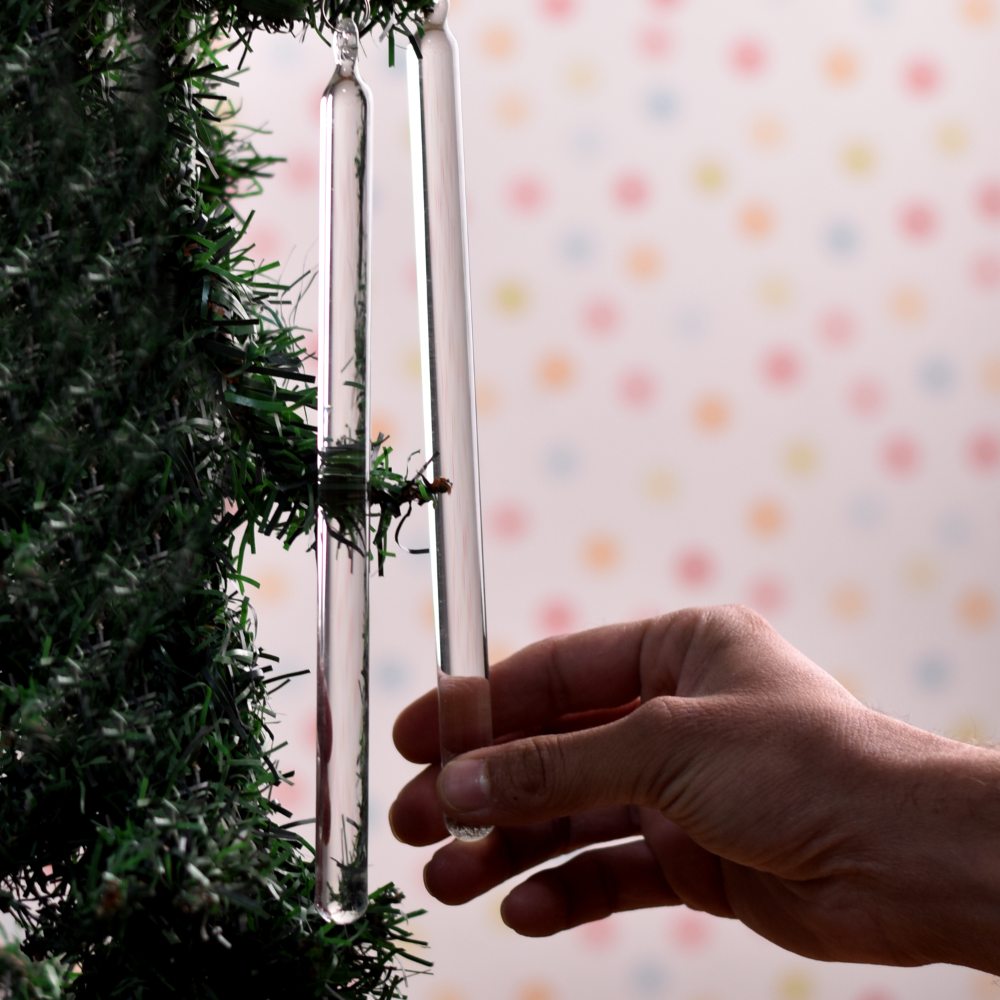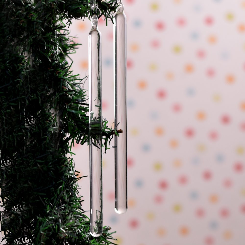 Celebrate the magic of Christmas with our handmade glass Christmas ornament set, lovingly crafted by highly talented artisans from India. Each ornament is a stunning, elongated glass stick, carefully shaped from premium-quality glass to achieve a flawless crystal-clear appearance. This set includes 6 of these enchanting ornaments, perfect for adorning your Christmas tree with elegance and charm. These handcrafted treasures are more than just decorations; they are the embodiment of traditional craftsmanship and heartfelt artistry. Hang them on your tree to create a captivating display that reflects the spirit of the season. Whether you're decorating your own home or looking for a thoughtful gift, these glass ornaments make for a memorable and cherished present for your near and dear ones during special or festive occasions.