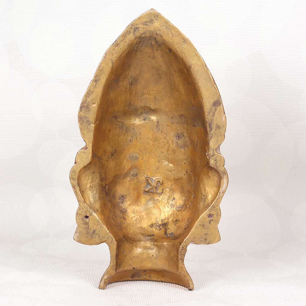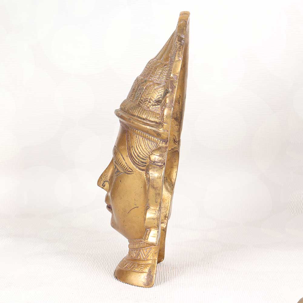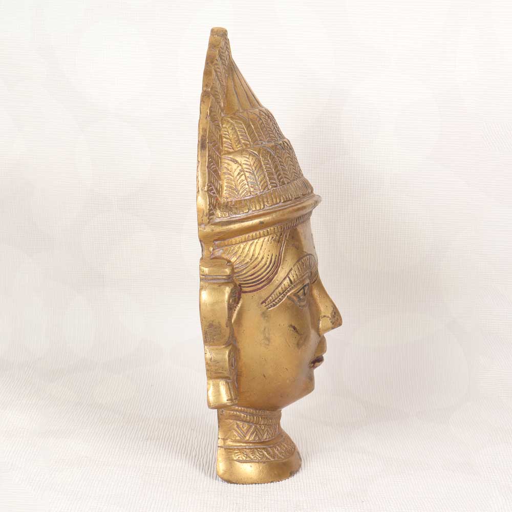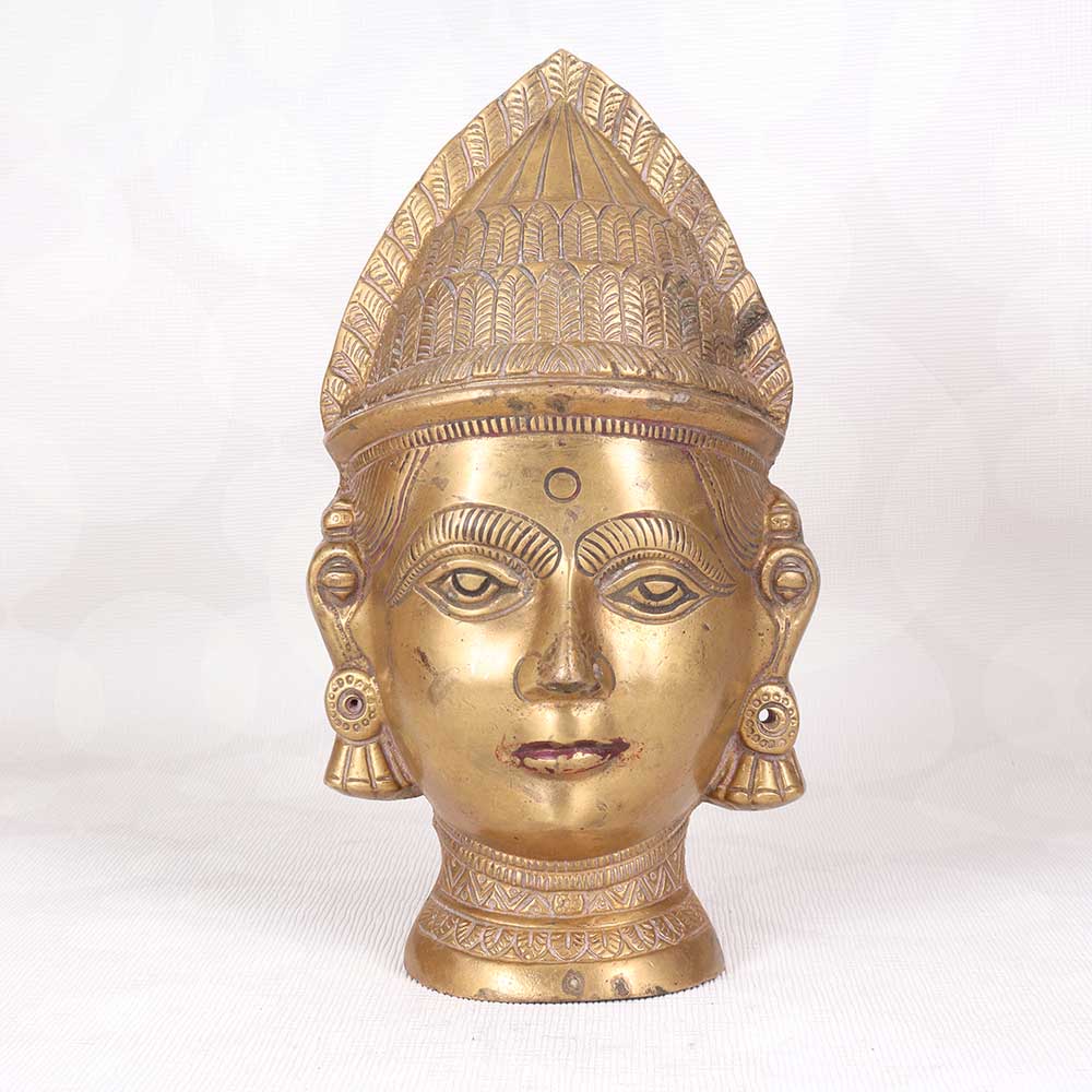 Immerse yourself in old-world spiritual motifs with this antique brass statue of Gauri's head, crafted in Western India. This Hindu goddess of purity emanates tranquility, her eyes downcast and expression serene. Feel the tension melt away as you gaze upon her sublime face. This vintage sculpture is cast from solid brass polished to a warm, lustrous glow. Intricate patterns adorn Gauri's jewelry and traditional headwear, evidence of the masterful metalworking techniques used to create this antiquity. Display this graceful icon on a shelf, console or tabletop to uplift your home with her peaceful presence. Her cultural allure and artisanal craftsmanship make her an intriguing accent piece for any decor. She makes a meaningful gift for yogis, spiritual seekers or collectors drawn to Eastern iconography. Let this antique Gauri head statue connect you to the roots of yoga and remind you to nurture inner calm. Her sublime beauty and devotion will fascinate guests and remind you to slow down, tune out distractions, and cultivate equanimity in your own life.
