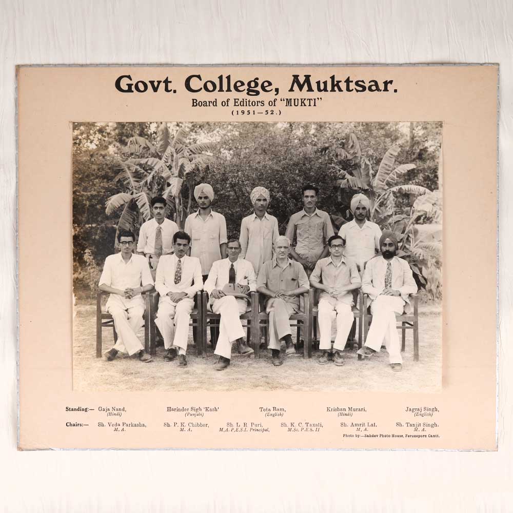 Take a trip down memory lane with this stunning vintage black and white photograph from Govt. College, Muktsar! This striking print captures the Board of Editors of 'Mukti' in 1951-52, transporting you back to a simpler time. This mesmerizing photograph offers a glimpse into the past, showcasing the editors posing together in their classic attire. The crisp black and white tones allow you to imagine yourself right alongside these young scholars from decades ago. Ideal for anyone who attended Govt. College, Muktsar during this era, this print would make a thoughtful gift to honor and celebrate your alma mater. Displaying this piece of history in your home or office pays homage to the storied past of your college days. With its timeless appeal, this vintage photograph is sure to spark nostalgic conversations for years to come.